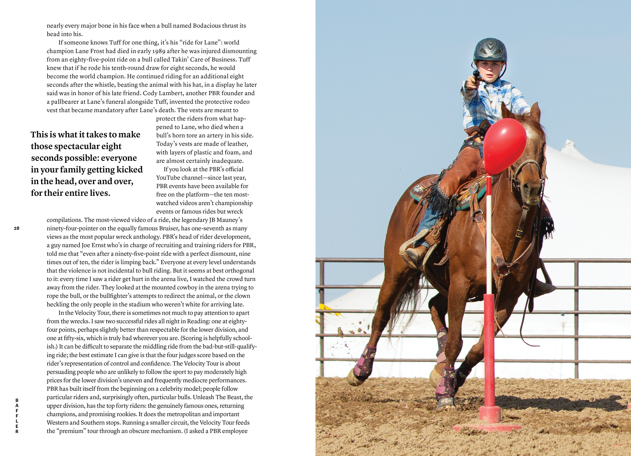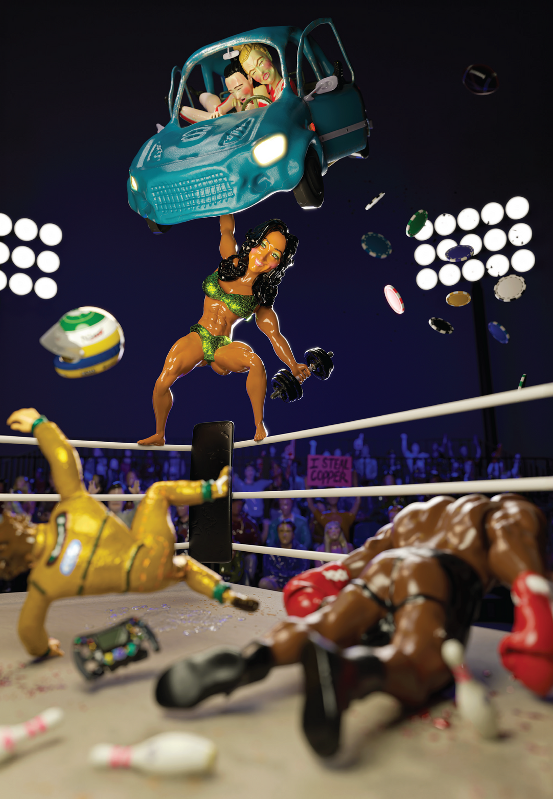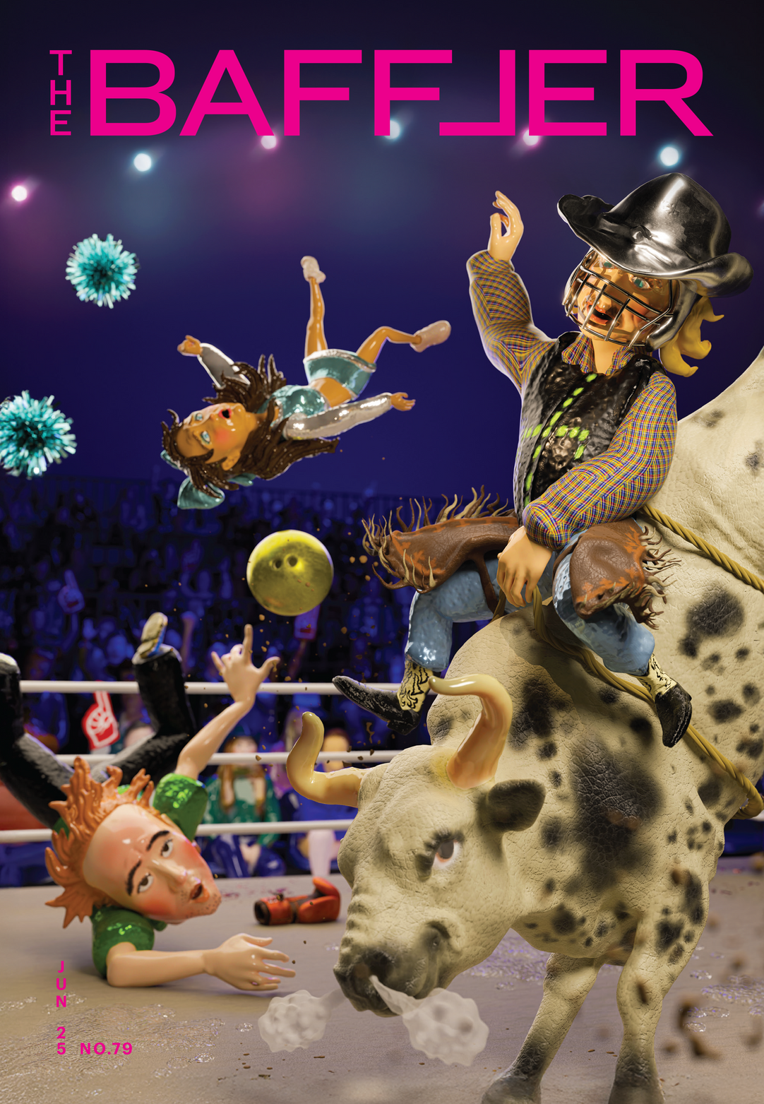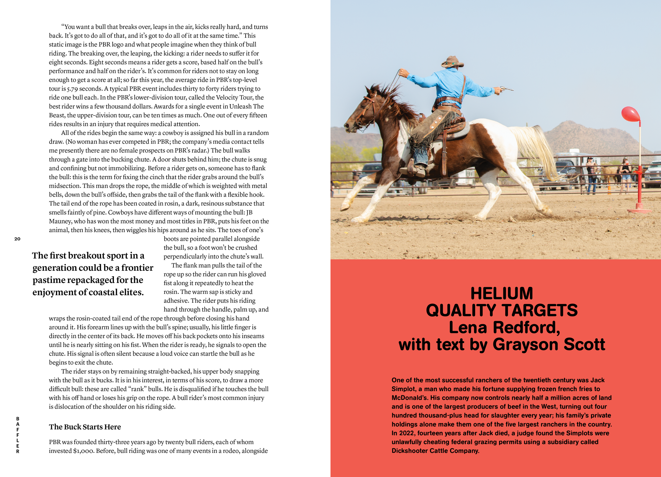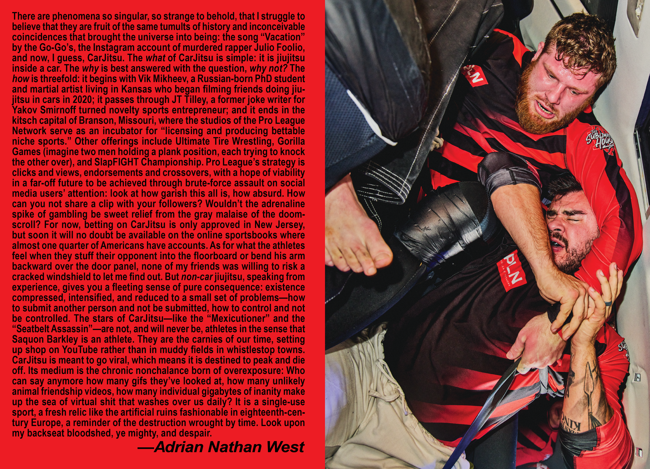 “Player Haters” surveys the state of competition in Fortress America, where the only flourishing industries are sports betting and YouTube. The latter’s vloggers have embraced the country’s masculinist turn: fewer suicide forest pranks and tiny-mic’d street interviews, more beating the shit out of each other. Sean Nam demonstrates how influencers took over the dying sport of boxing, selling sloppy bouts to an uneducated audience while decrepit and corrupt regulatory bodies played blind and profited big. Elsewhere in violence, mixed-martial-arts moguls TKO Group Holdings, Inc. have diversified, now proffering Professional Bull Riders, a multimillion-dollar novelty league that sells highlight reels of bovine-on-man accidents and the Western frontier as not a place but a vibe, per Grayson Scott, easily accessible everywhere given this nation’s omnipresent fears of invasion. Country-fried LARPing continues in Lena Redford’s exhibit of cowboy mounted shooting, while Tristan deBrauwere’s photos of CarJitsu—i.e., jiujitsu in a car—depict another breed of vehicle-based brutality. No one has choked out a Formula 1 driver at 230 miles per hour, but perhaps one of the citizens of Las Vegas might chance it, aggrieved, as David Hill shows, by the city’s many capitulations to the racing league.