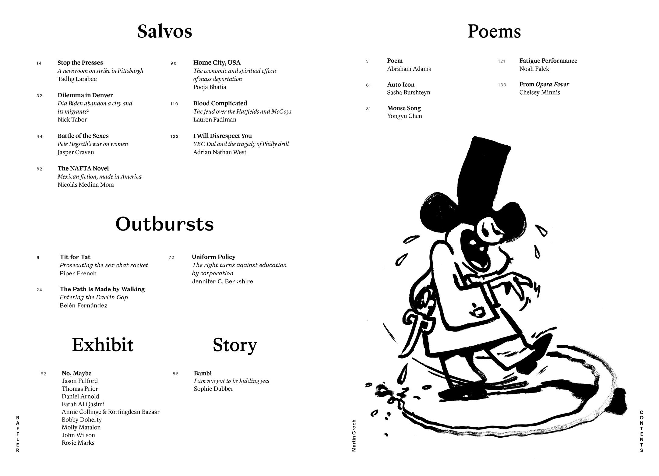 Journalists are on the scoreboard of this country’s resentments, but the nearly fifty million immigrants in residence seem to have taken first place. Belén Fernández leads readers into the Darién Gap, that treacherous stretch of jungle traversed by many recent arrivals, where smugglers serve as de facto U.S. border guards. Nick Tabor describes how Denver attempted to navigate these surges of immigration with little assistance from the Biden administration and open hostility from its successor—a vehemence Trump has extended toward the Haitians of Springfield, Ohio, as Pooja Bhatia reports. And Nicolás Medina Mora writes on the cultural legacy of the North American Free Trade Agreement, which devastated Mexico such that both farmers and fiction writers sought a new life north of the border.
