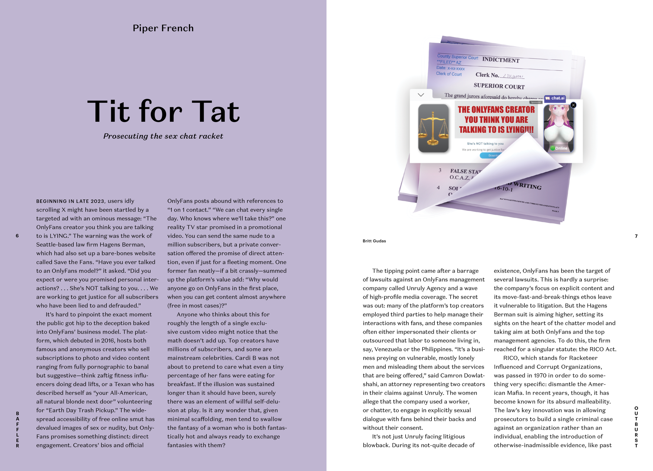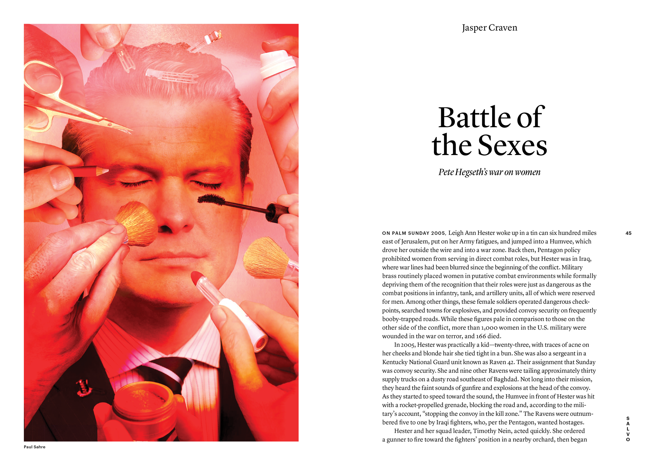 Elsewhere in the issue, contributors consider a feud old as time: man against nature or, increasingly, its replacement. Piper French asks whether RICO lawsuits against OnlyFans creators or the automation of pretending to be a nubile all-American natural blonde will put low-paid “chatters” on the platform out of a job. Facing a future of employment made uncertain for all by artificial intelligence, Jennifer C. Berkshire ponders why the idea that our schools might teach values besides corporate growth has been ceded to right-wingers. Those touting “patriotic education” have included Pete Hegseth, whose long-running war against women inside the military and out is chronicled by Jasper Craven.