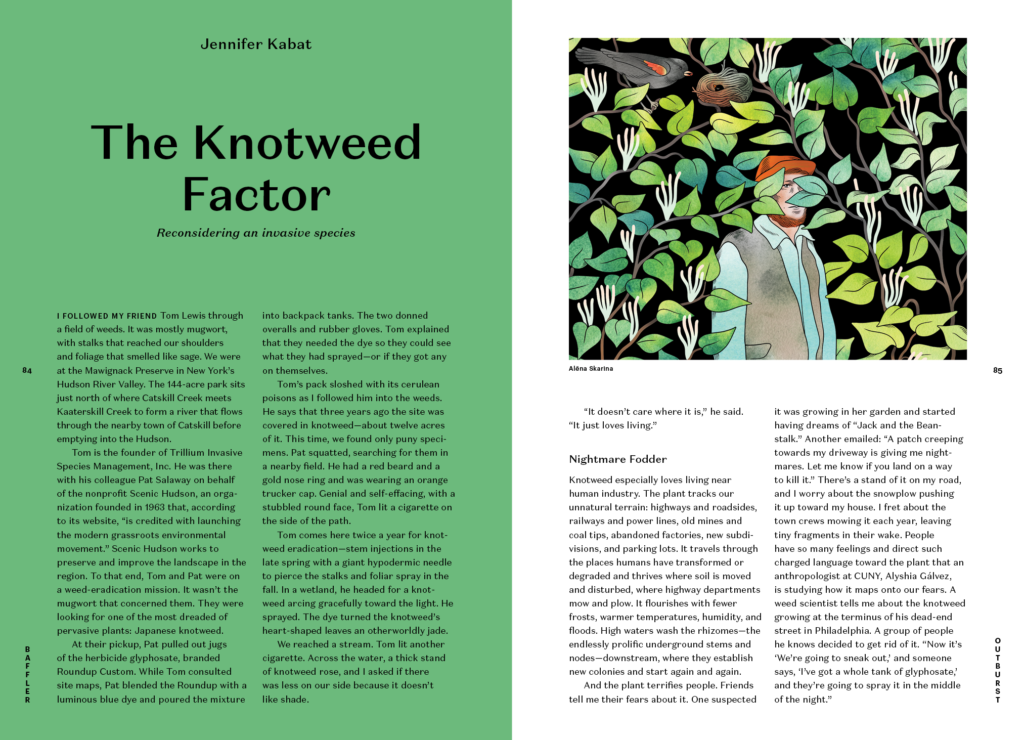 What’s one to do, then, as the wildfires rage and insurance companies pull out of markets, per Tyler Maroney’s interview with a public insurance adjuster? Antinatalists champion our own demise—“May we live long and die out,” goes the motto of the Voluntary Human Extinction Movement. That’s a narrative that’s a bit hard to swallow for those who have been born, and those who will give birth, though other mothers aren’t always so reassuring, as Madeleine Watts learns reading books about pregnancy while herself being pregnant. If we’ll never be able to undo the worst of our actions, perhaps we can appreciate nature’s adaptations, as Jennifer Kabat does with knotweed, an invasive plant species particularly fond of highways and parking lots, the latter’s flora chronicled in Andrew Conboy and Bobby Doherty’s field guide to what grows in the asphalt by the mini-mall.