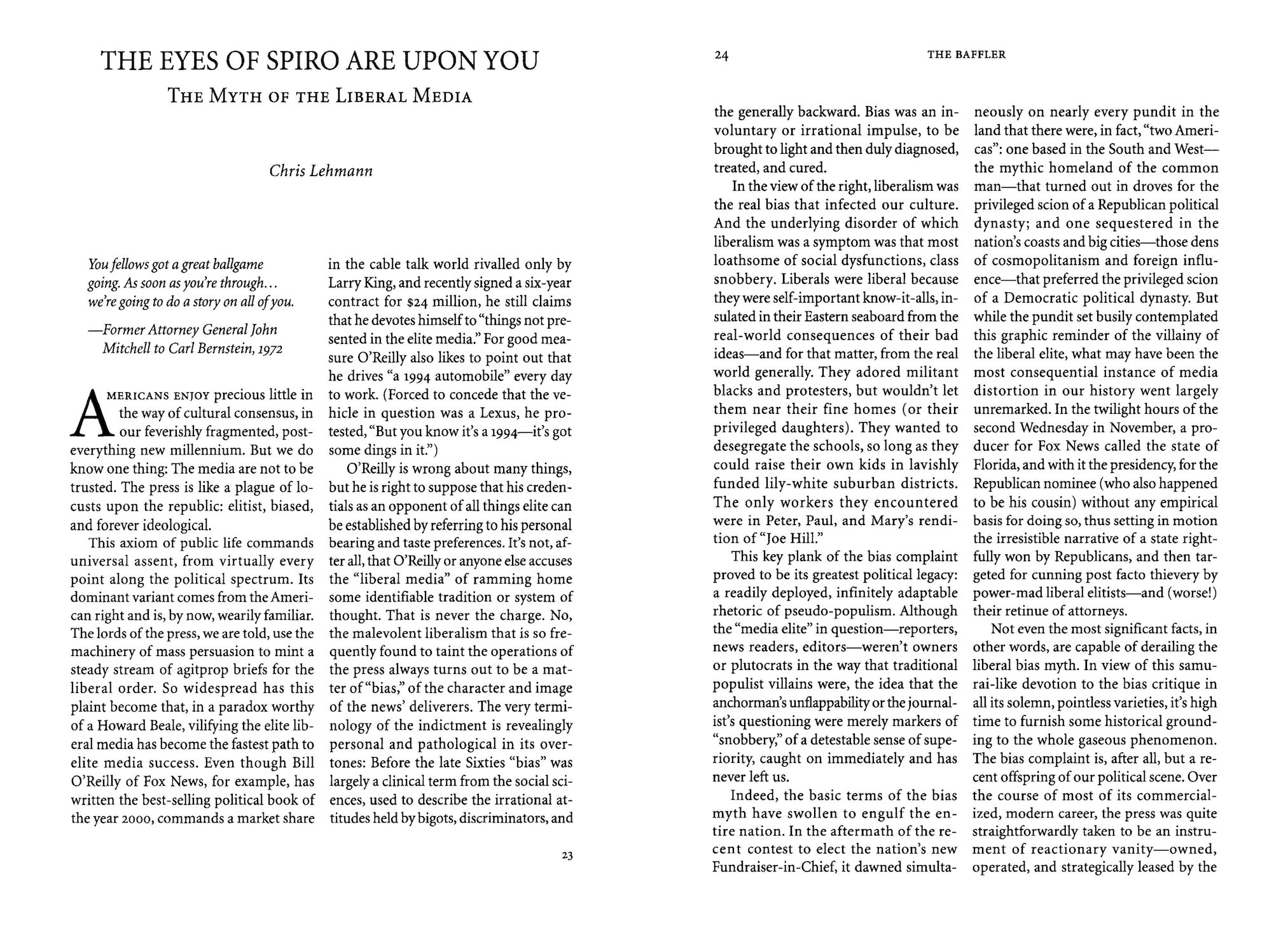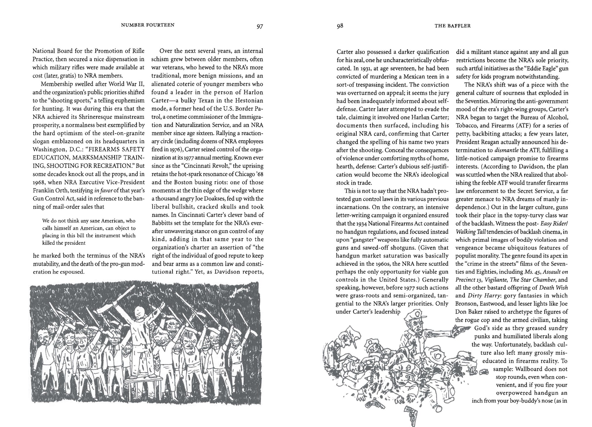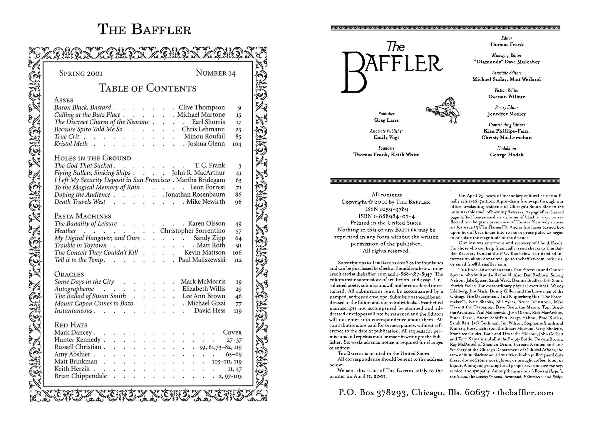 An issue about that ungracious deity, the Market, which starts off by wondering why Americans continue to love their shabby god when it sure doesn’t love them back. Mike Newirth narrates the awful story of the gun culture. Josh Glenn blames youth quiescence on the brainwashing power of OK Soda. Clive Thompson describes Conrad Black’s effort to bring an American-style backlash to Canada. Earl Shorris recalls his personal fight with the neocons. Chris Lehmann traces the long history of the liberal-media myth. Harper’s magazine publisher John R. MacArthur remembers the backlash election of 1972 and the sparsely populated political group, Republicans for McGovern. Martha Bridegam ponders the beginnings of the real estate bubble in booming San Francisco. With fiction from Christopher Sorrentino and Leon Forrest, plus a legendary illuminated cover by Mark Dancey. A classic issue—at the printer when fire destroyed the Baffler office in Chicago.
