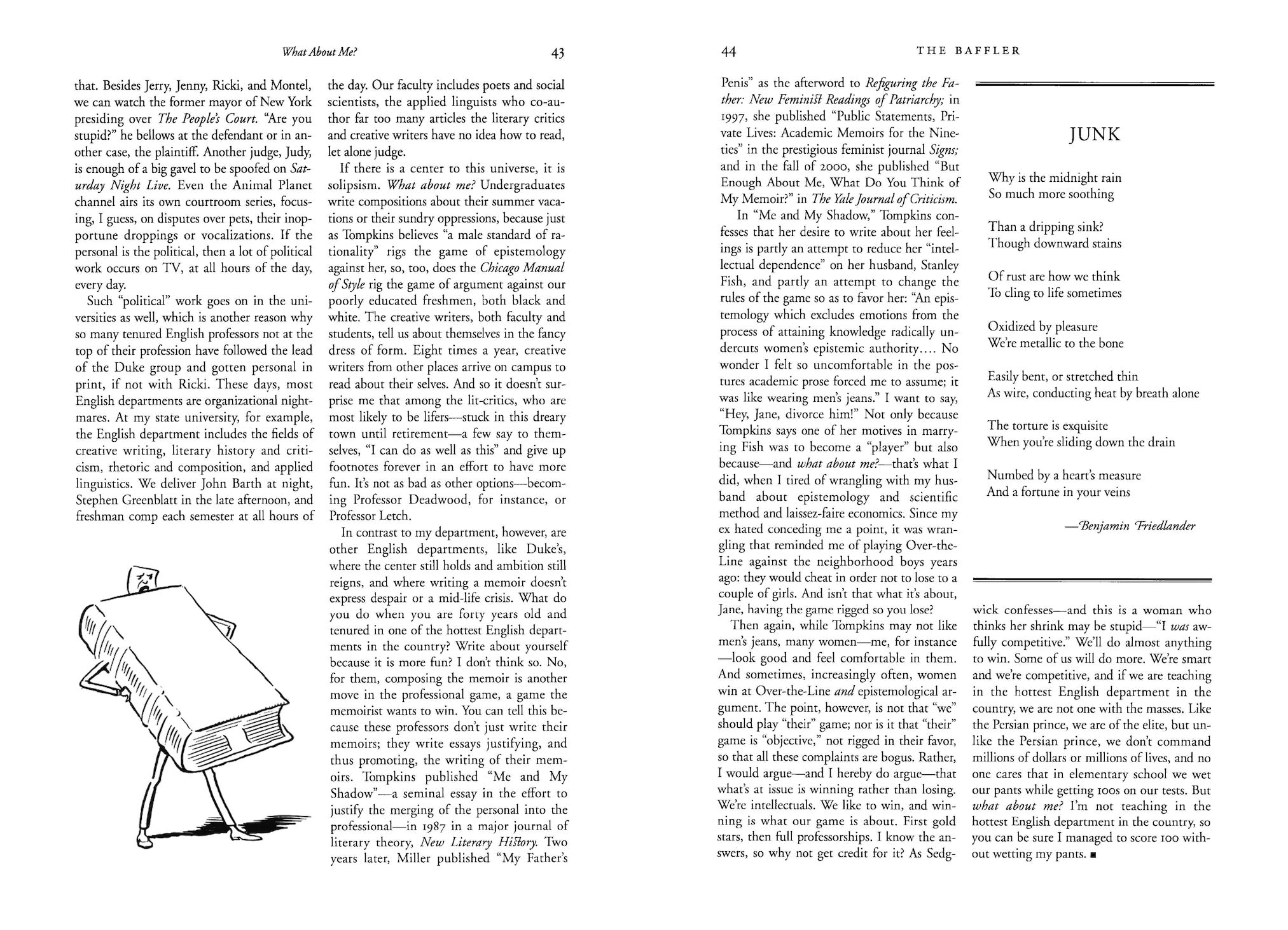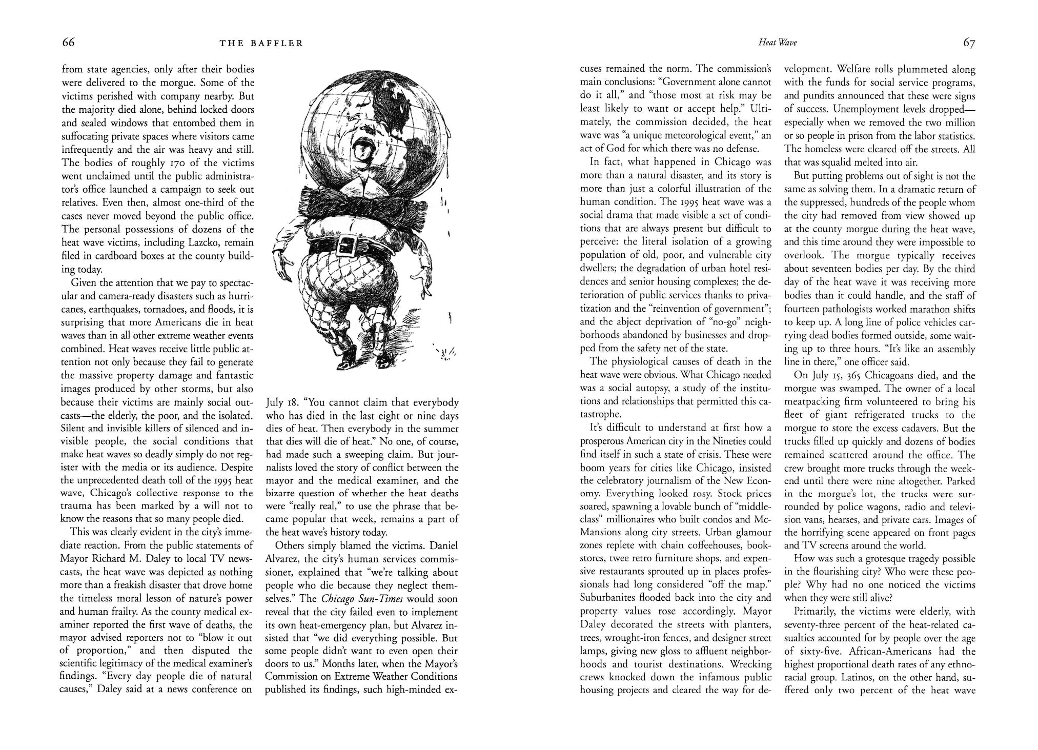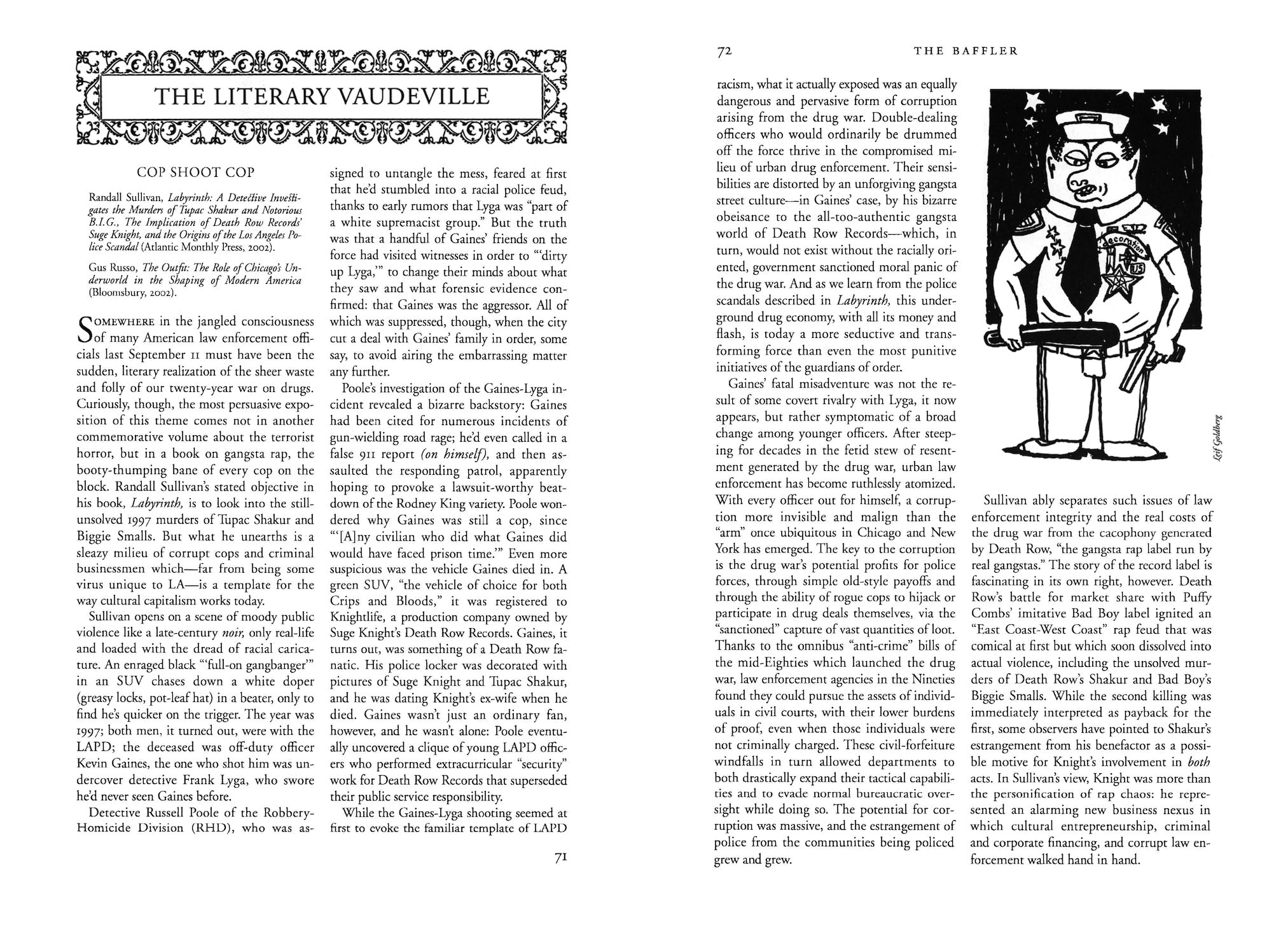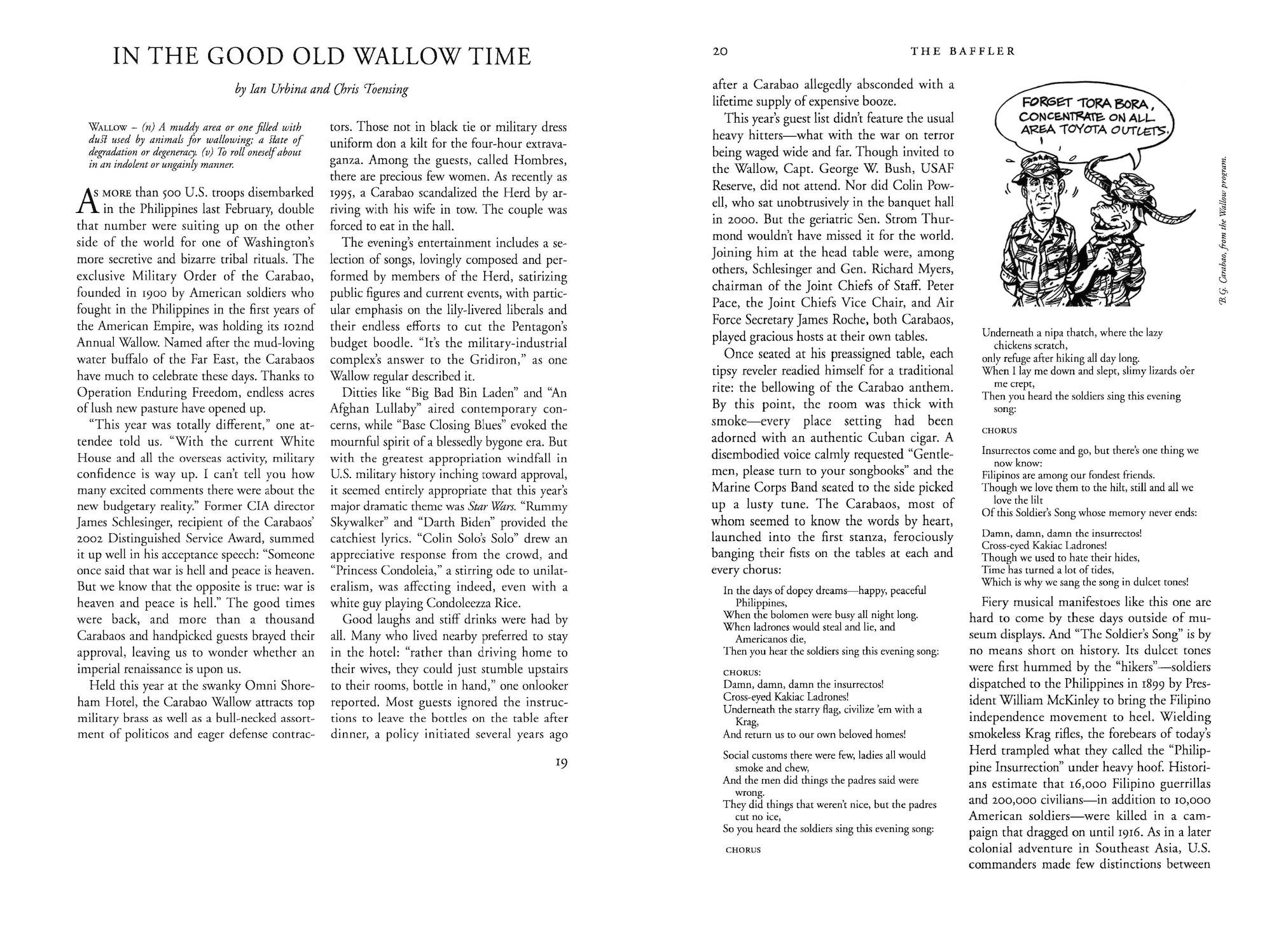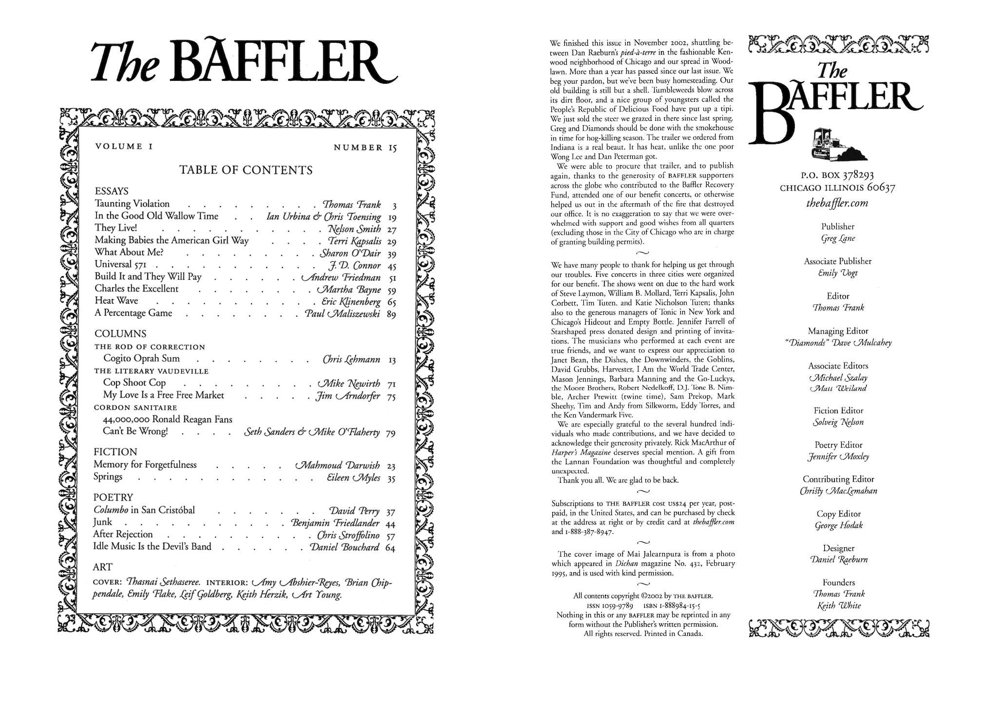 The Global War on Terror has begun, and Ian Urbina and Chris Toensing tell of a colorful military clique wallowing in the new wave of defense dollars. Thomas Frank makes a pilgrimage to the Super Bowl. Martha Bayne appraises the cult of culinary excellence surrounding a certain celebrity chef. Andrew Friedman gets beneath the swirly titanium skin of the Bilbao Guggenheim. Terri Kapsalis draws frightening parallels between artificial insemination and American Girl dolls. Sharon O’Dair tells of the ne plus ultra in scholarly self-absorption: academic memoirs. J. D. Connor reads a submarine movie as a glorified deal memo for a corporate merger. Seth Sanders and Mike O’Flaherty remember rock music’s part in the backlash. With poetry from Daniel Bouchard.