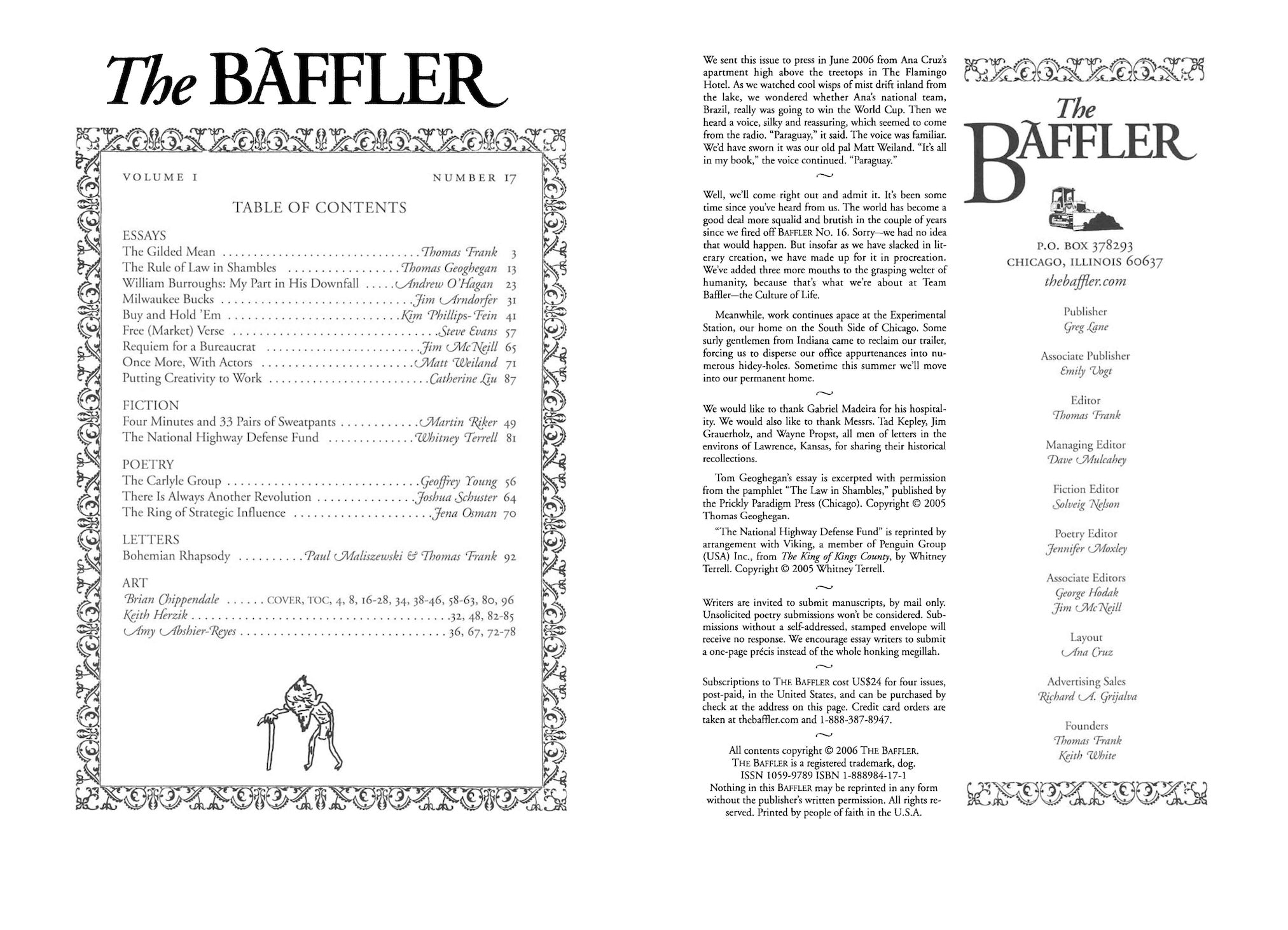 This one we produced in Chicago and Washington, D.C., at the tippy-top of the bubble. Thomas Frank describes the Washington culture of centrism. Thomas Geoghegan tells what inequality does to the rule of law. Andrew O’Hagan remembers where he was when William S. Burroughs died. Jim Arndorfer reveals how the fortune of a Milwaukee plutocrat helped to change the nation’s politics. Kim Phillips-Fein understands online poker as a symbol for bubble-time economics. Steve Evans describes the rise of backlash poetry and “Free-Market Verse.” Jim McNeill honors labor bureaucrat Victor Reuther. Catherine Liu observes the ultimate commodification of dissent in Singapore. Matt Weiland marvels at Chautauqua reenactors. With fiction from Martin Riker and Whitney Terrell.