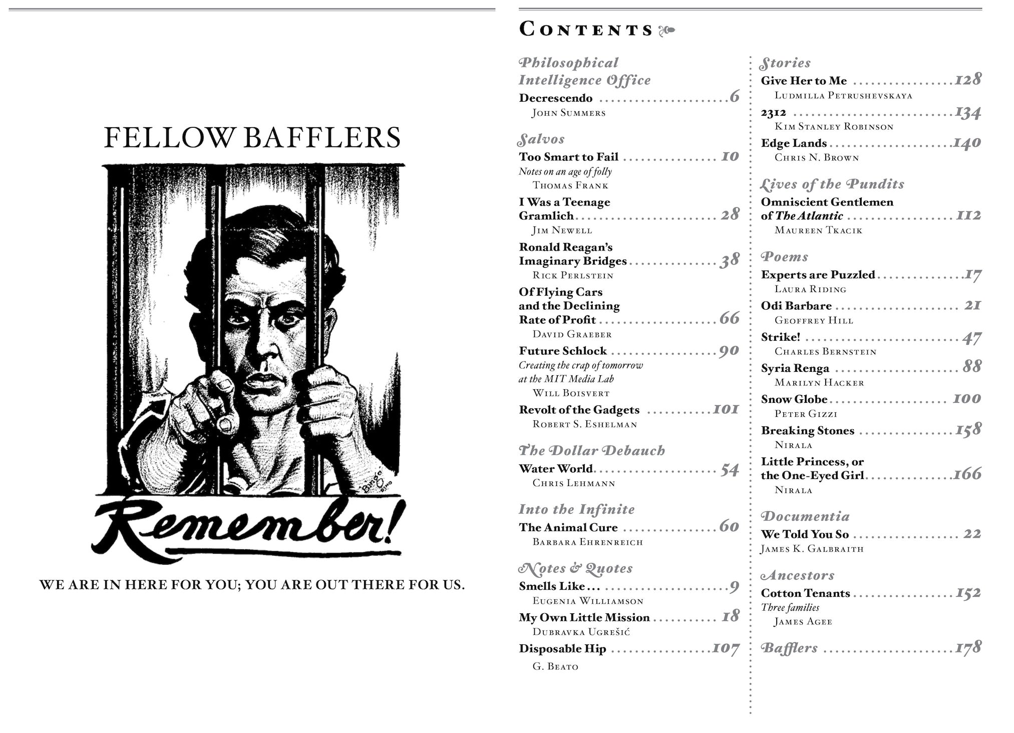 The fallout from the financial crash continues—everywhere but Silicon Valley’s profit center. Alighting on the bloodless crossroads of culture and technology, this issue was driven there by Thomas Frank’s “Too Smart to Fail,” David Graeber’s “Of Flying Cars and the Declining Rate of Profit,” and Maureen Tkacik’s hilarious satire of The Atlantic magazine. Barbara Ehrenreich, Rick Perlstein, Jim Newell, and James K. Galbraith all contributed. There’s fiction by Ludmilla Petrushevskaya and Kim Stanley Robinson, plus poetry by Geoffrey Hill.