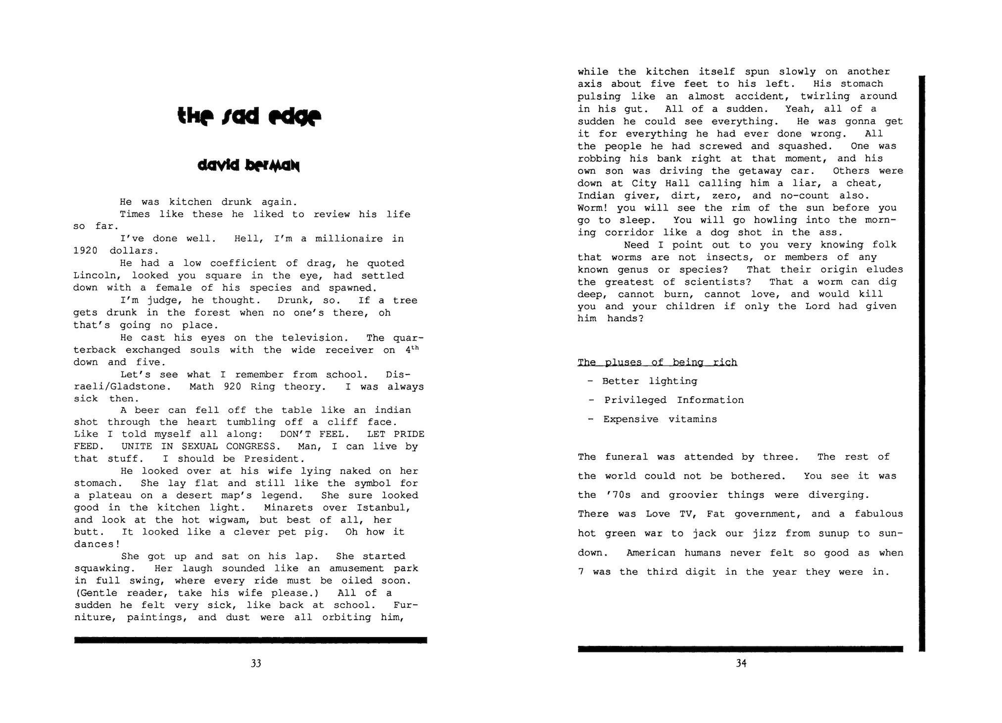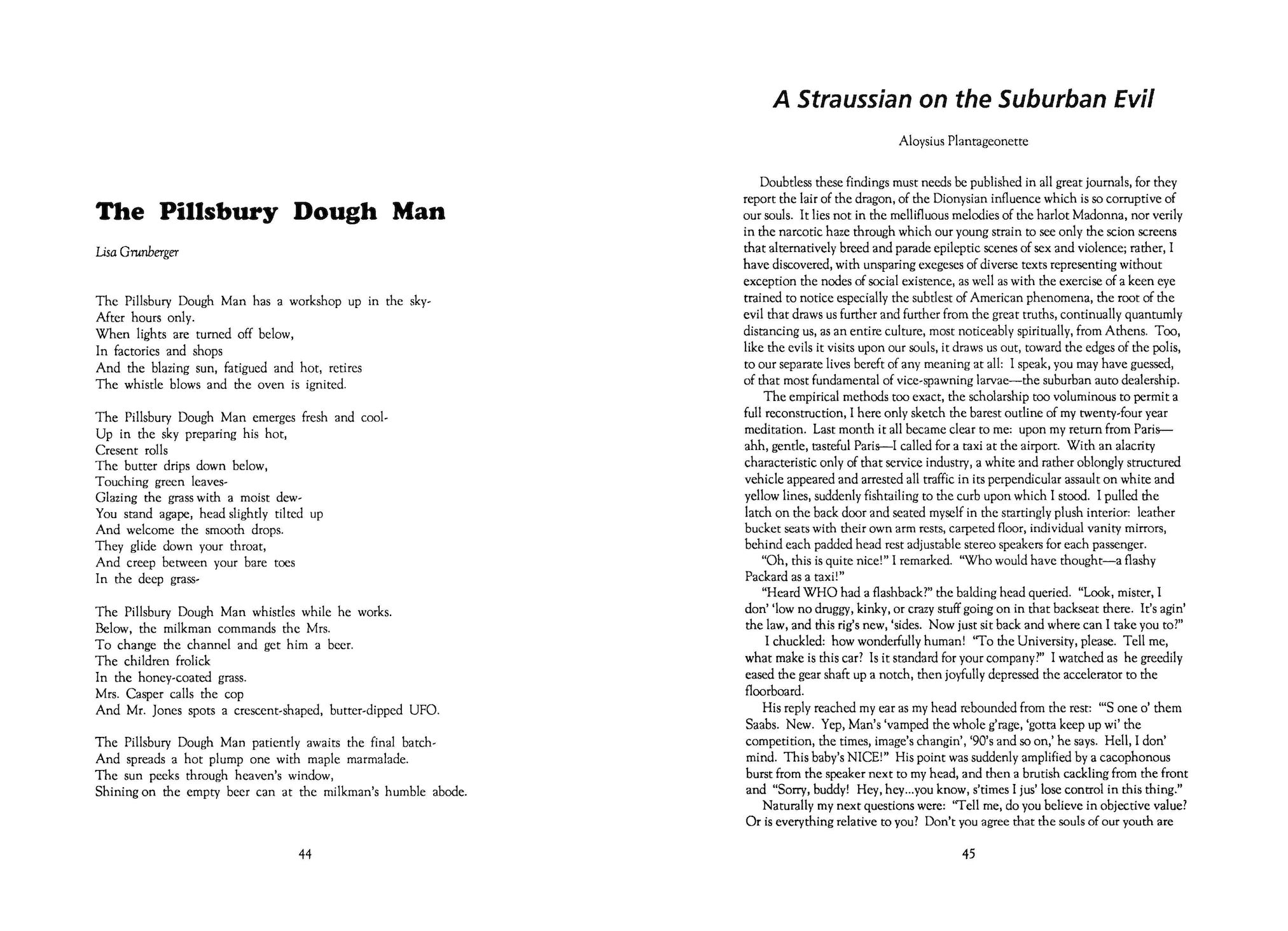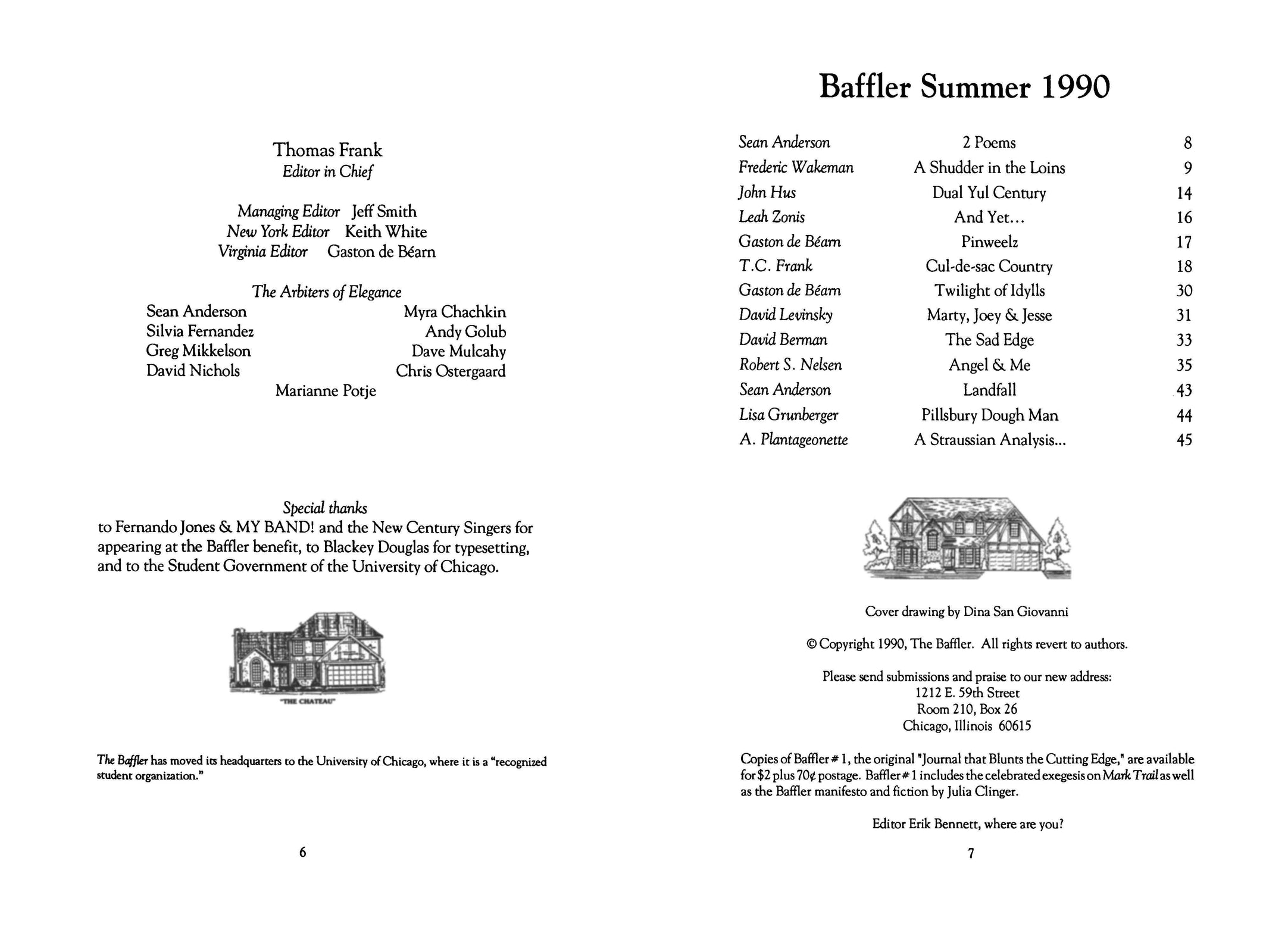 The yellow issue was conceived as an homage to those familiar fears of “mass society” and the great concern of many decades past: conformity! “In a time when the ‘cutting edge’ has become a powerful tool for mediocratization,” our editor declared, “we proudly rededicate ourselves to its blunting.” The anxious-making midcult of the time included arts festivals sponsored by tobacco companies and the “affected playground cynicism” of nineties suburbanites. Produced at the University of Chicago in the summer of 1990, our second issue ran forty-eight pages.