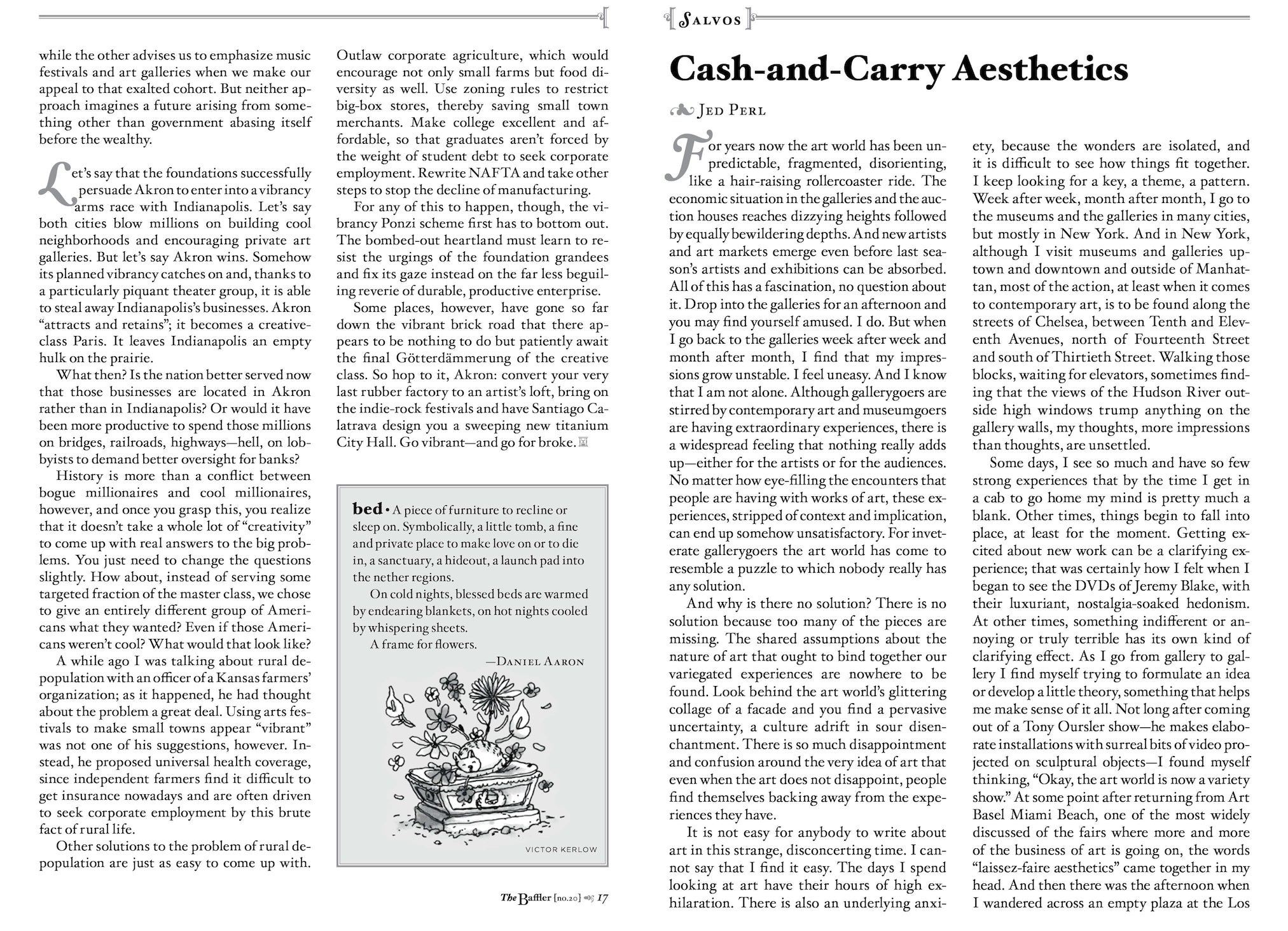 In our summer culture issue, we bring you decomposing cities that tremble with vibrancy, art museums where cash-and-carry aesthetics are the rule, journalists on the endless education of the president, and imperial foundations and their pet broadcasters on public radio. Where else can you learn why Eugenia Williamson thinks Ira Glass’s This American Life is so annoying, or take in Steve Almond on the lame, postideological pantomiming of Jon Stewart and Stephen Colbert, or admire, with Jim Newell, the performance art of Harvard fraud Adam Wheeler and laugh at the Ivy mothership’s efforts to smite the pretender down?