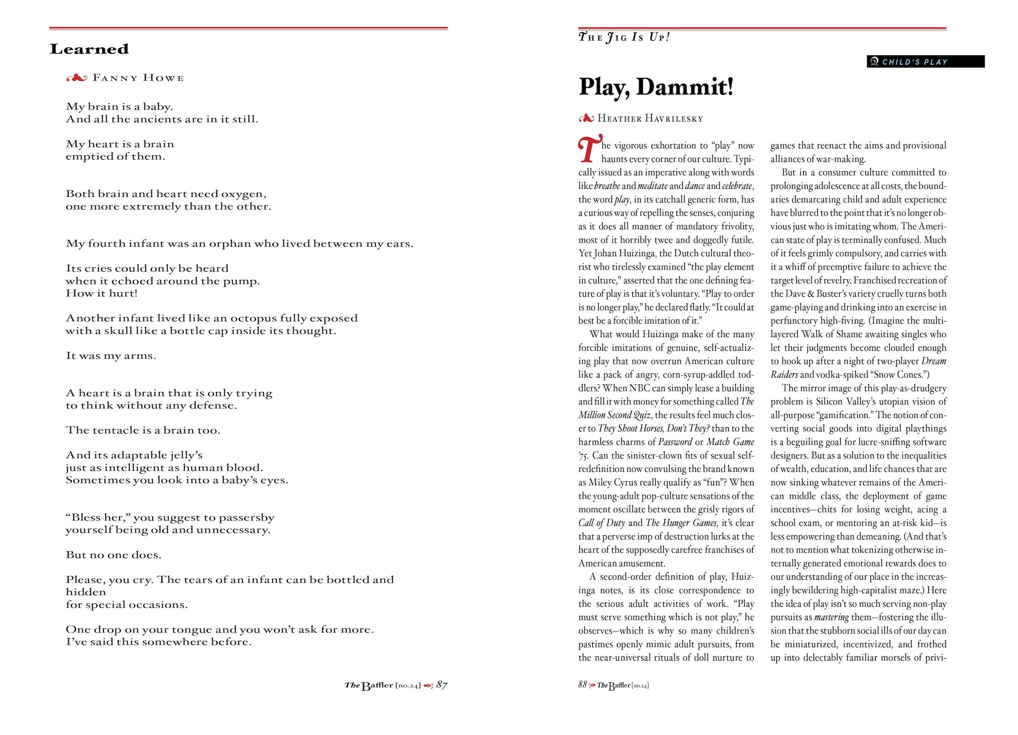 Hey, it’s our play issue, in which David Graeber hopscotches over the robotic universe of contemporary science and winds up inventing a new law of reality. Barbara Ehrenreich calls for a science that can explain why fun is fun. John Summers reports from “The People’s Republic of Zuckerstan”—once known as the liberal community of Cambridge, Massachusetts, now a playground for startup science and tech professionals. Gene Seymour rescues science fiction from the warped real-world utopias of certain plutocratic cybervisionaries. Andrew Bacevich dances on the grave of Tom Clancy, the recently departed hack thriller writer. Ian Bogost analyzes the addiction economy lurking behind cutting-edge free-to-play videogames, while Rhonda Lieberman walks us through the trophy rooms of leisure-class art hoarders.