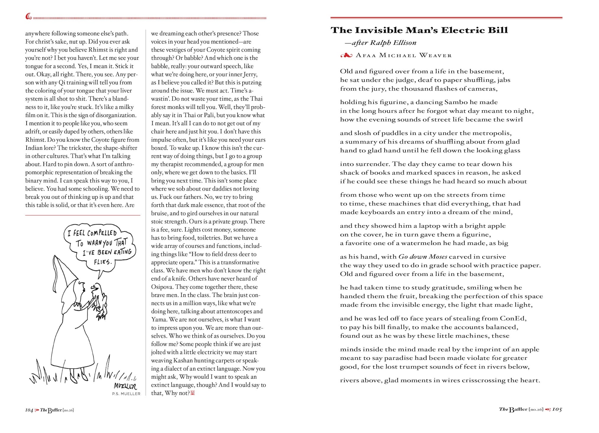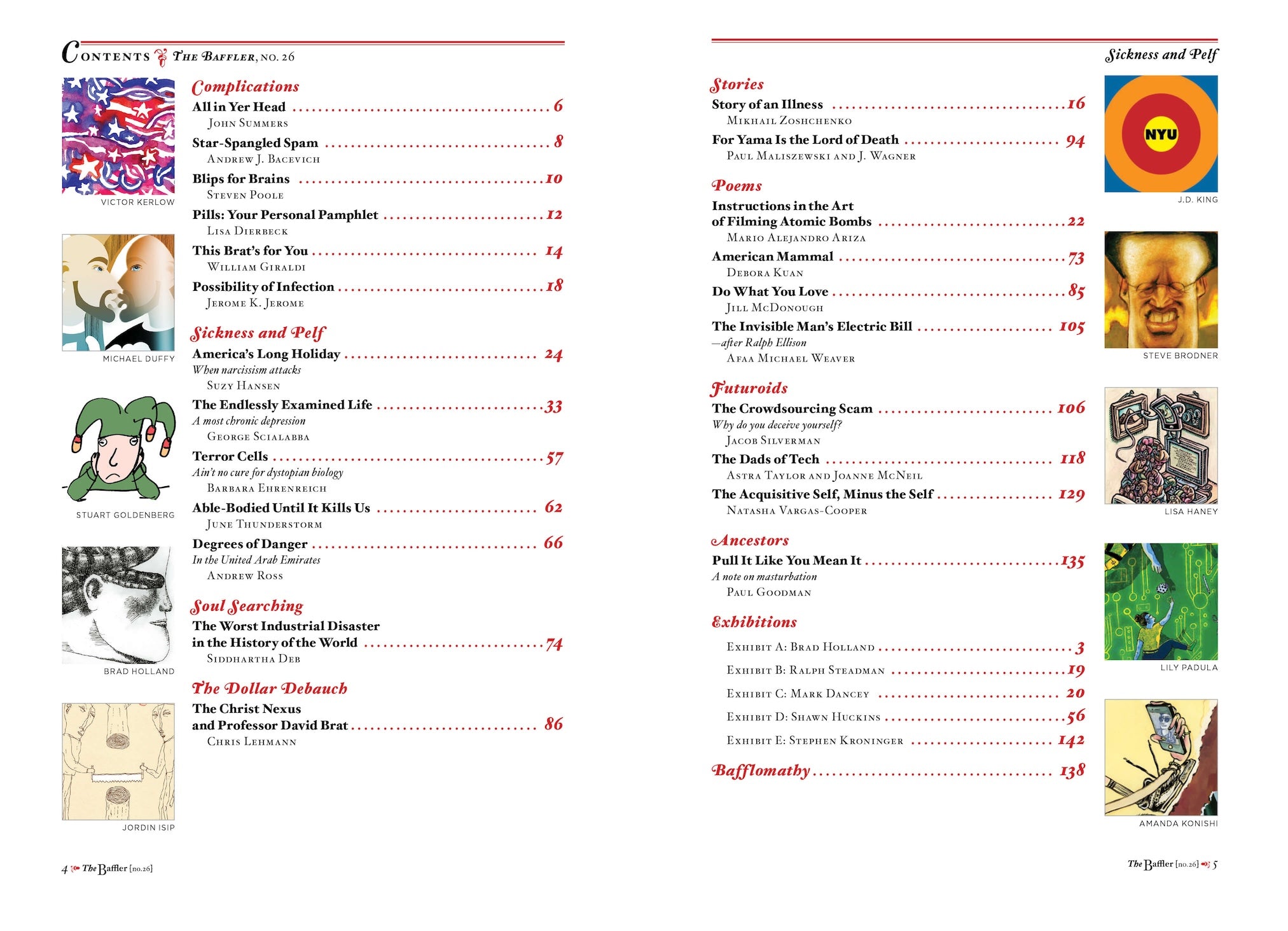 Follow William Giraldi, an uxorious young father who receives paternity leave, only to turn this gift of time into alcoholism. Read Barbara Ehrenreich’s ethnography of the decision-making cells in the human body. Stumble along with George Scialabba through a lifetime of therapy for chronic depression. Marvel at Jerome K. Jerome, the student who opens a medical encyclopedia and catches hypochondria, or June Thunderstorm’s vanguard of acronym-drunk disability-rights activists who sport the latest stylings in class privilege. Learn all about the stupid tech that Steven Poole knows won’t save our faltering bodies and minds.