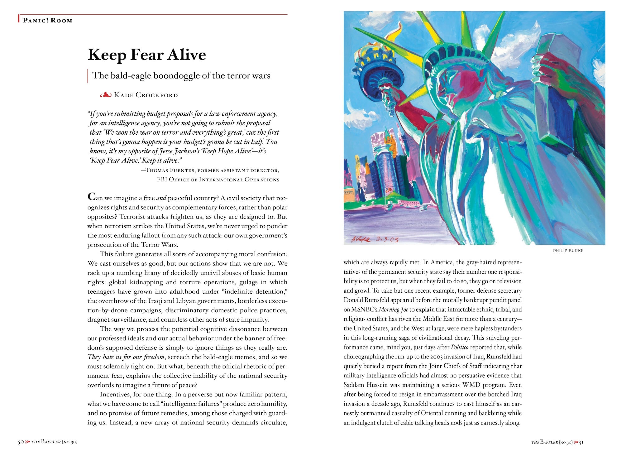 While the Dead Kennedys lamented, in the first flush of the punk era, that they were too drunk to fuck, we say that the country, high and low, has now become too scared to think. It writhes in the grip of a collective panic attack, a case of the sweaty palms, a crack-up of faith in the future—a claustral terror that our bipolar political system cannot hope to allay, but can only stoke to greater furies.