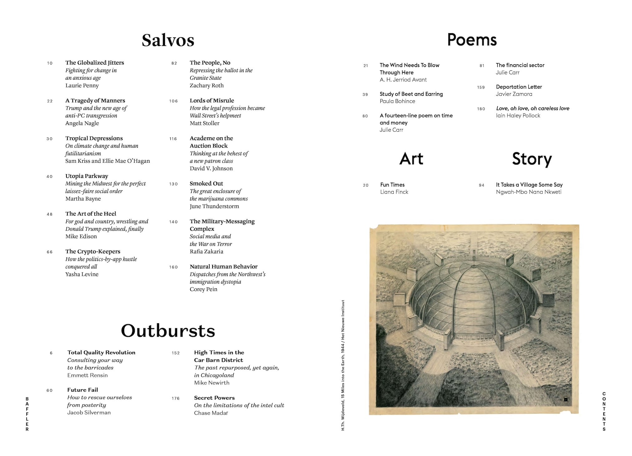 In Baffler No. 36, “A Crack in Everything,” we take a more sober look at this amnesiac, binge-drinking approach to social improvement as we imagine it to be foreordained in these United States. Sam Kriss and Ellie Mae O’Hagan explore how all the many worst-case scenarios associated with drastic climate change have poisoned our ability to experience our own humanity as anything other than grim folly. Yasha Levine has an edifying scoop on the ever-widening reach of our surveillance state.