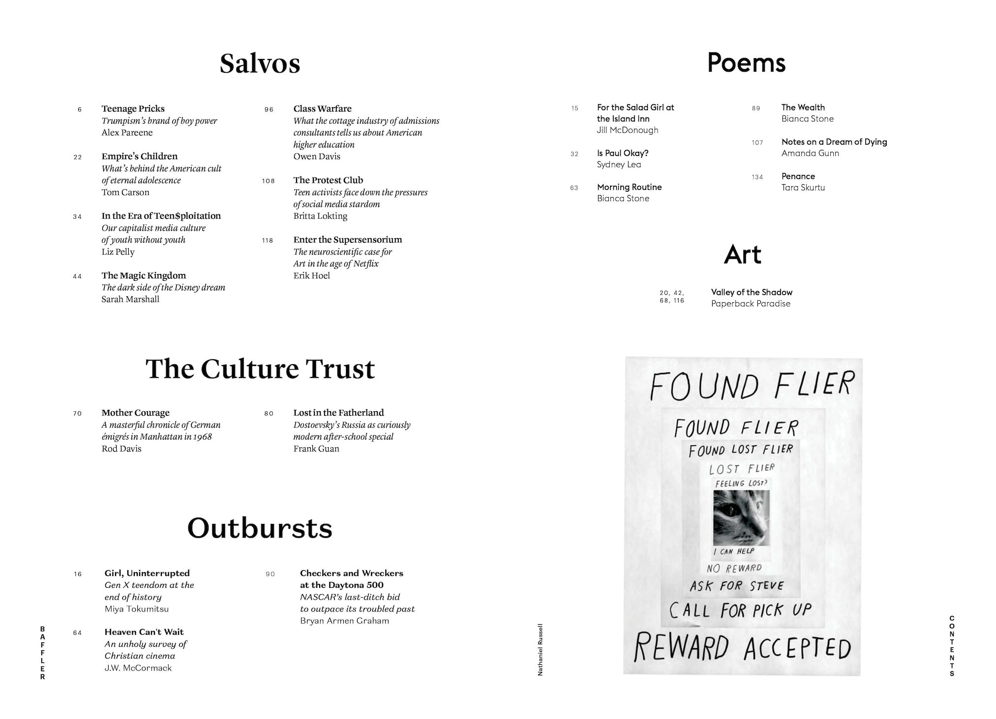 In Baffler no. 45, our stalwart contributors puzzled over the state of American adolescence and our collective fascination with coming-of-age tales. In an eclectic set of nostalgia trips, fact-finding missions, and theoretical explorations, our crack investigators uncovered a nation in a pervasive state of arrested development.