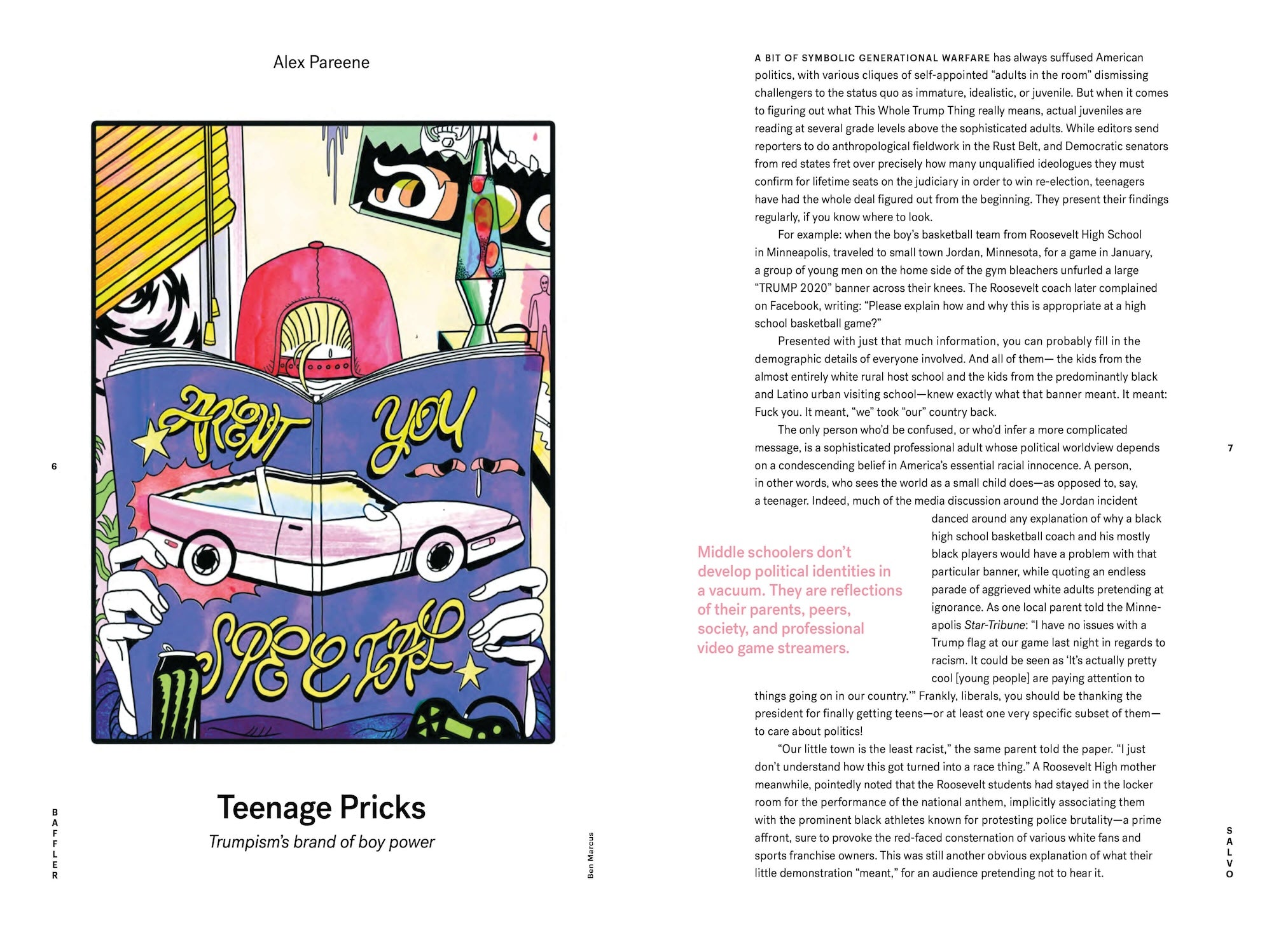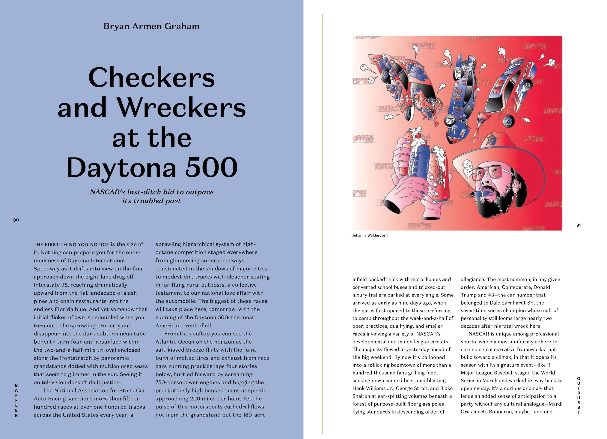 Alex Pareene studies MAGA teens and their adult advocates, who bend over backwards in order to defend not just their prep school princelings, but the entire social order that conflates goodness with status. After all, innocence is the exclusive provenance of those who can afford it, as Sarah Marshall makes clear in her essay on the darker side of Disney’s dream empire. Bryan Armen Graham offers a dispatch from the Daytona 500, where NASCAR is making a last-ditch bid to win over a younger, broader audience. He finds that “these efforts, while admirable, lay bare the uneasy push-pull underlying the sport’s overture to minority customers: can the black and Hispanic fans that NASCAR desires feel welcome in an infield festooned with symbols like Confederate flags and MAGA banners that create an unwelcome environment?”