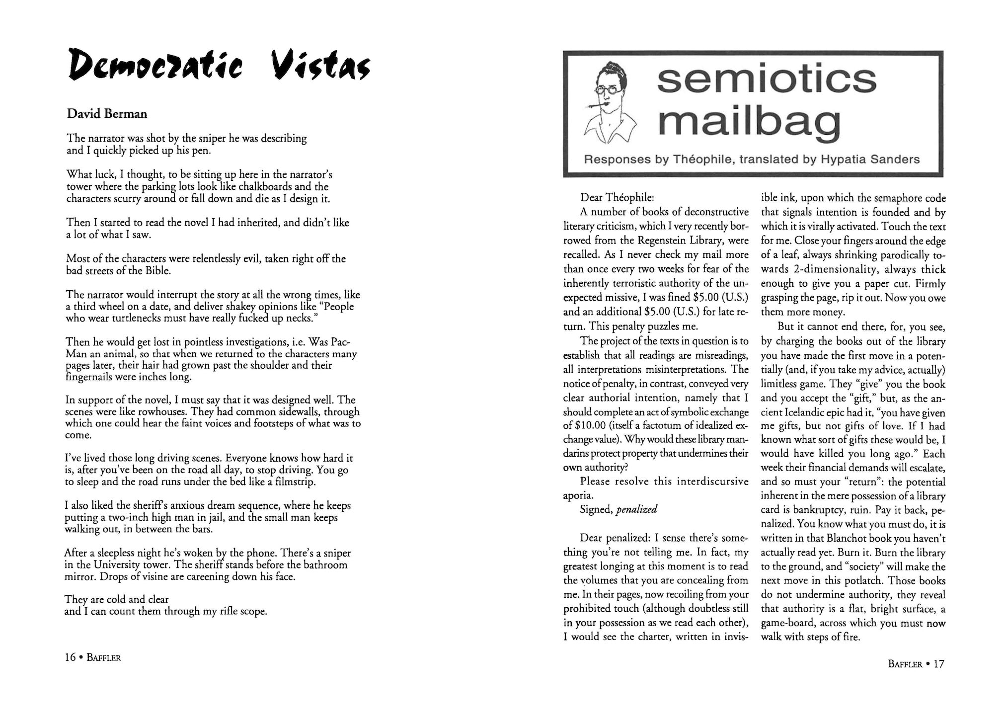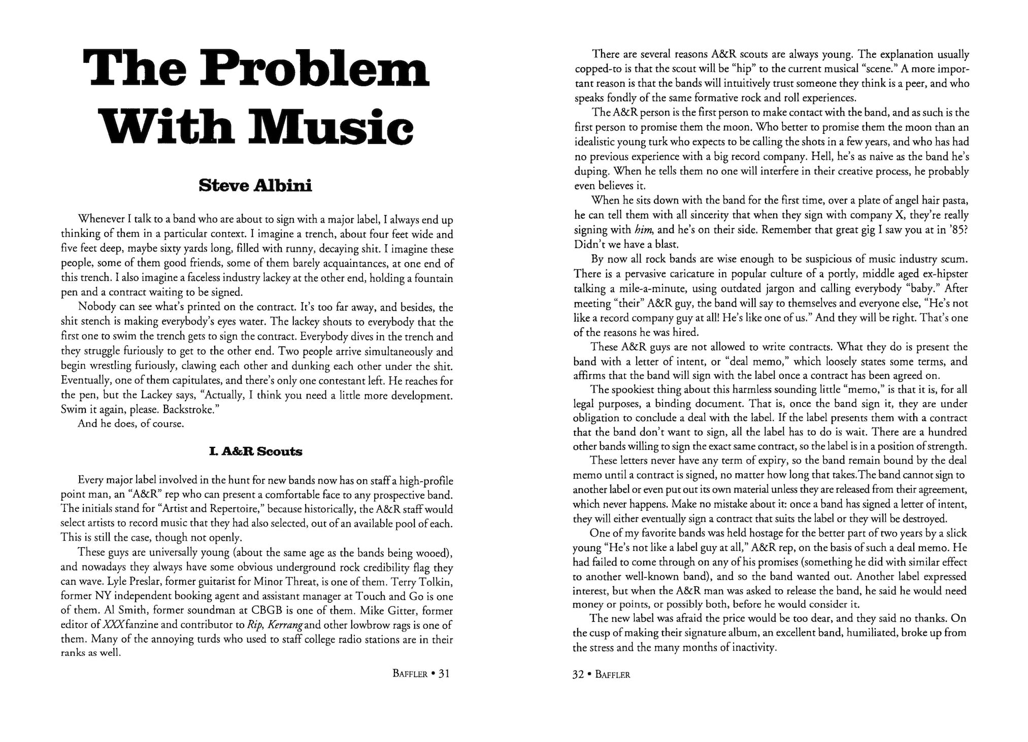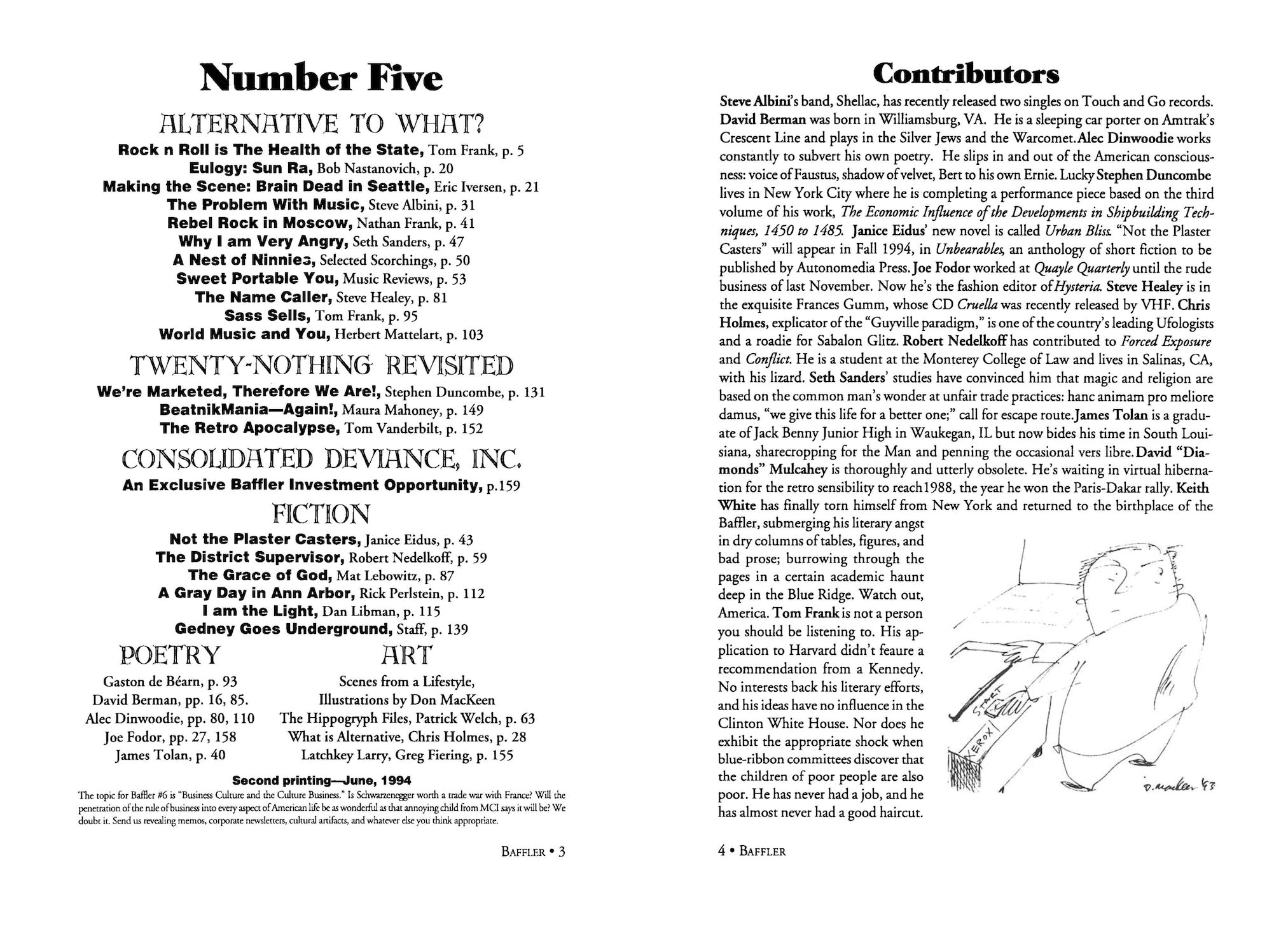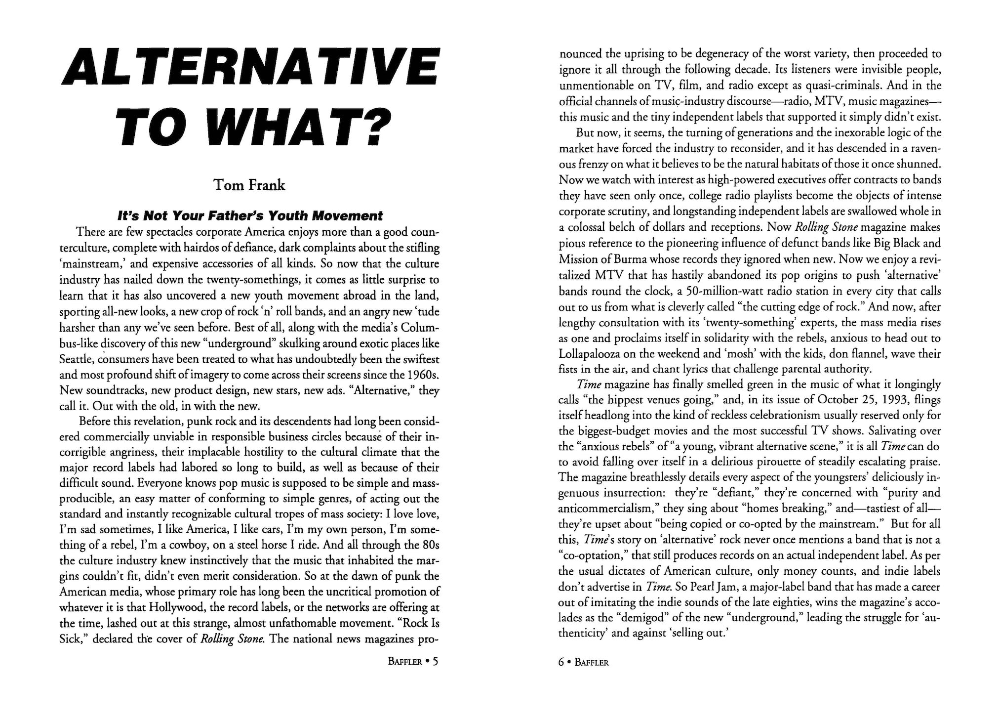 To fully appreciate this issue of The Baffler, you have to transport yourself to a time when the word “alternative” did not provoke a reflexive cringe. (Go back and watch the movie Singles, or just look at its theatrical release poster to get in the mood.) The war on corporate culture continues with Steve Albini’s “The Problem with Music,” an essay that compared the act of signing with a major label to traversing a trench filled with “runny, decaying shit.” Plus: Keith White’s legendary takedown of Details magazine. Then: Herbert Mattelart assails world music, Eric Iversen follows the search for the new Seattle, and Thomas Frank probes the nullity that is Pearl Jam. Maura Mahoney deflates the Beat revival, and Tom Vanderbilt wonders about the day when retro culture finally catches its own tail. Produced in November 1993 in the tiny office of WHPK-FM at the University of Chicago’s Reynolds Clubhouse, this was our biggest issue yet.