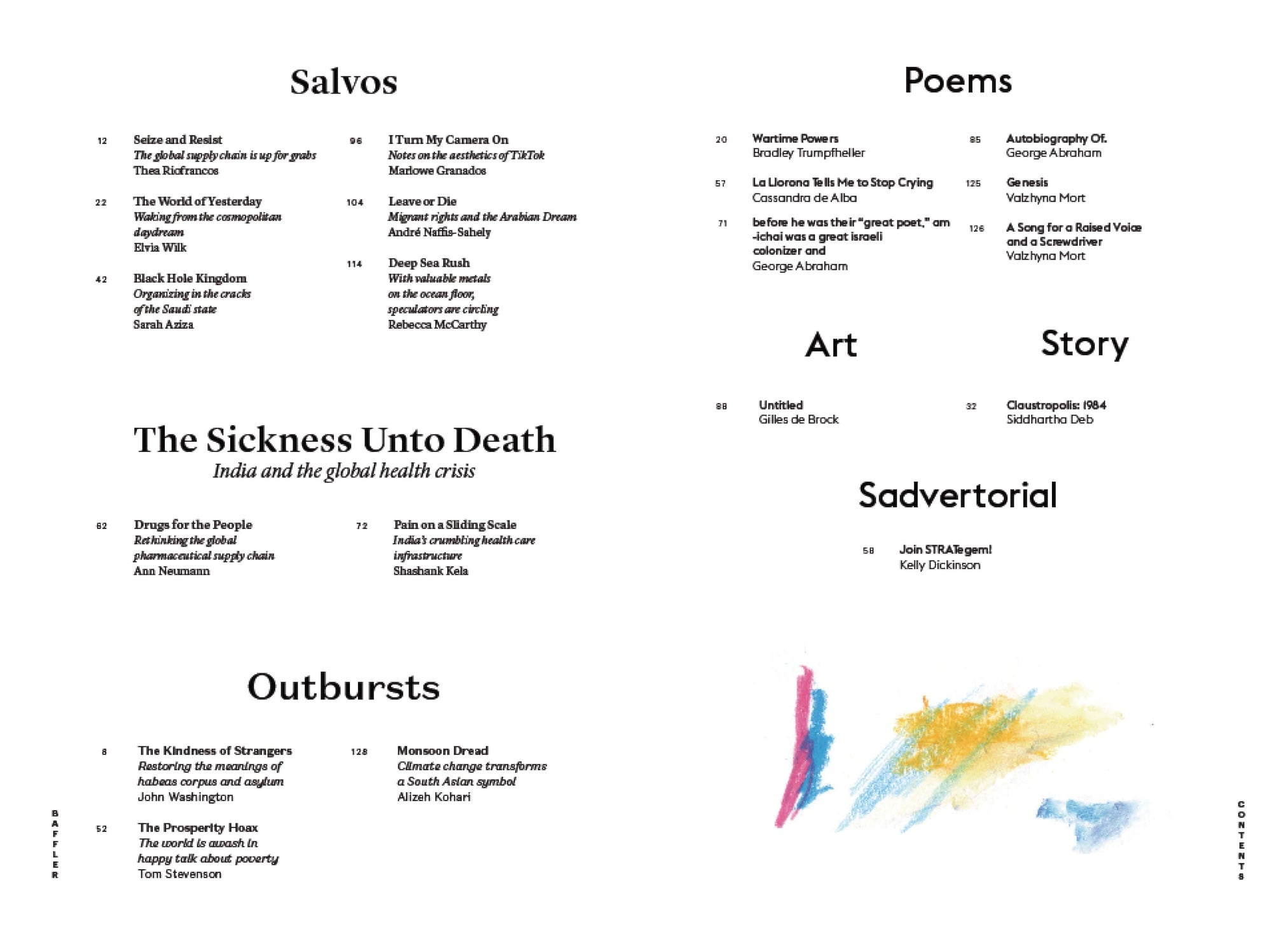 The essays in this issue of The Baffler, which we’re calling “ReGlobalization,” are not set moralistically against American domestic controversies of the sort weirdly churned out during presidential elections. There is no attempt to be more global than thou. And none of these contributors knew, as the reader does now, who was going to win the election. But taken together, they do acknowledge, as David Bromwich argues in Writing Politics, that “the idea of a good or tolerable society now encompasses relations between people at the widest imaginable distance apart.” And their response, if I may speak for them, is “no shit.”