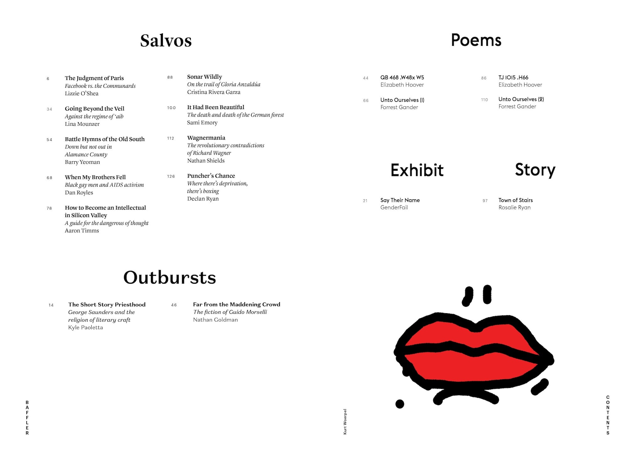 Here to add not much at all to the conversation are the renegade idiots of Silicon Valley, whose more recent intellectual pursuits have shown us, Aaron Timms writes, what happens when the counterpublic impulse goes strangely and stupidly wrong. The culture trust incubates its own particular stupidities, as Kyle Paoletta demonstrates in his essay on the craft advice of writer George Saunders, which seems “less like a creative endeavor than assembling flat-packed IKEA furniture,” and the homogeneity of contemporary MFA fiction. Meanwhile, Nathan Goldman and Cristina Rivera Garza find the counterpublic project explored and tested in the work of Guido Morselli and Gloria Anzaldúa, and Irish writer Declan Ryan writes about family, class, and boxing, a sport that has a foothold wherever deprivation can be found. Not all counterpublics, it turns out, are created with the same pretensions to equality.