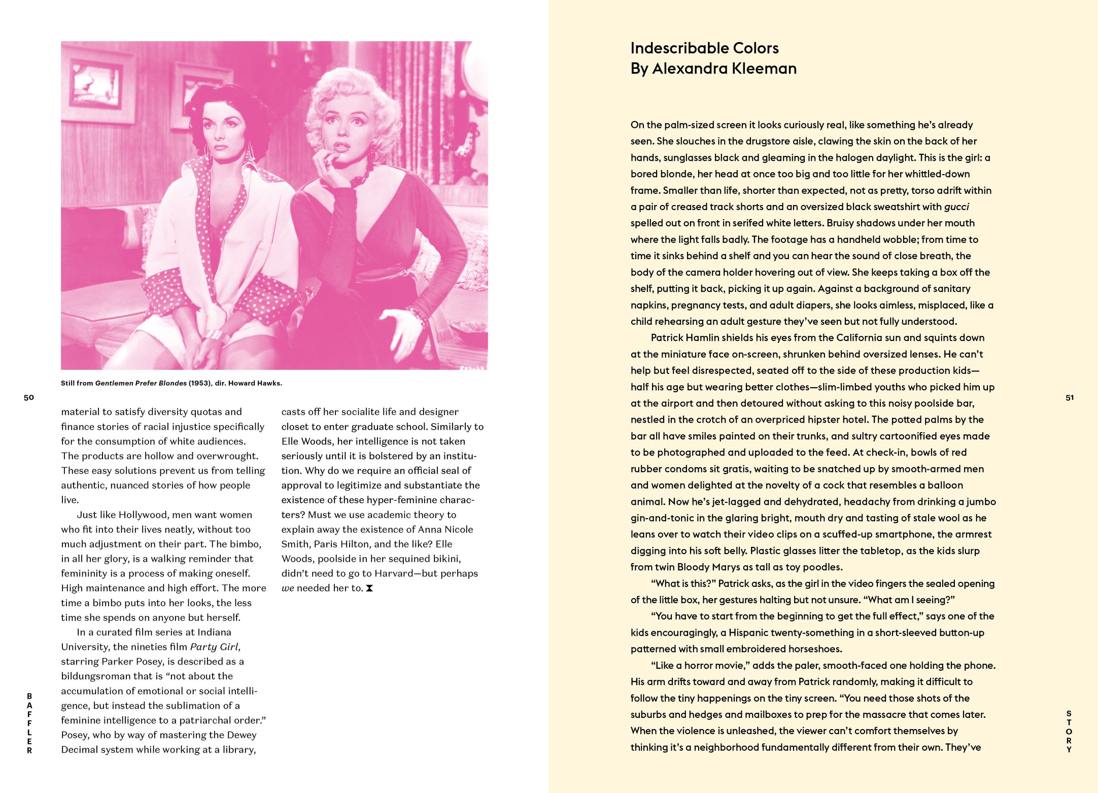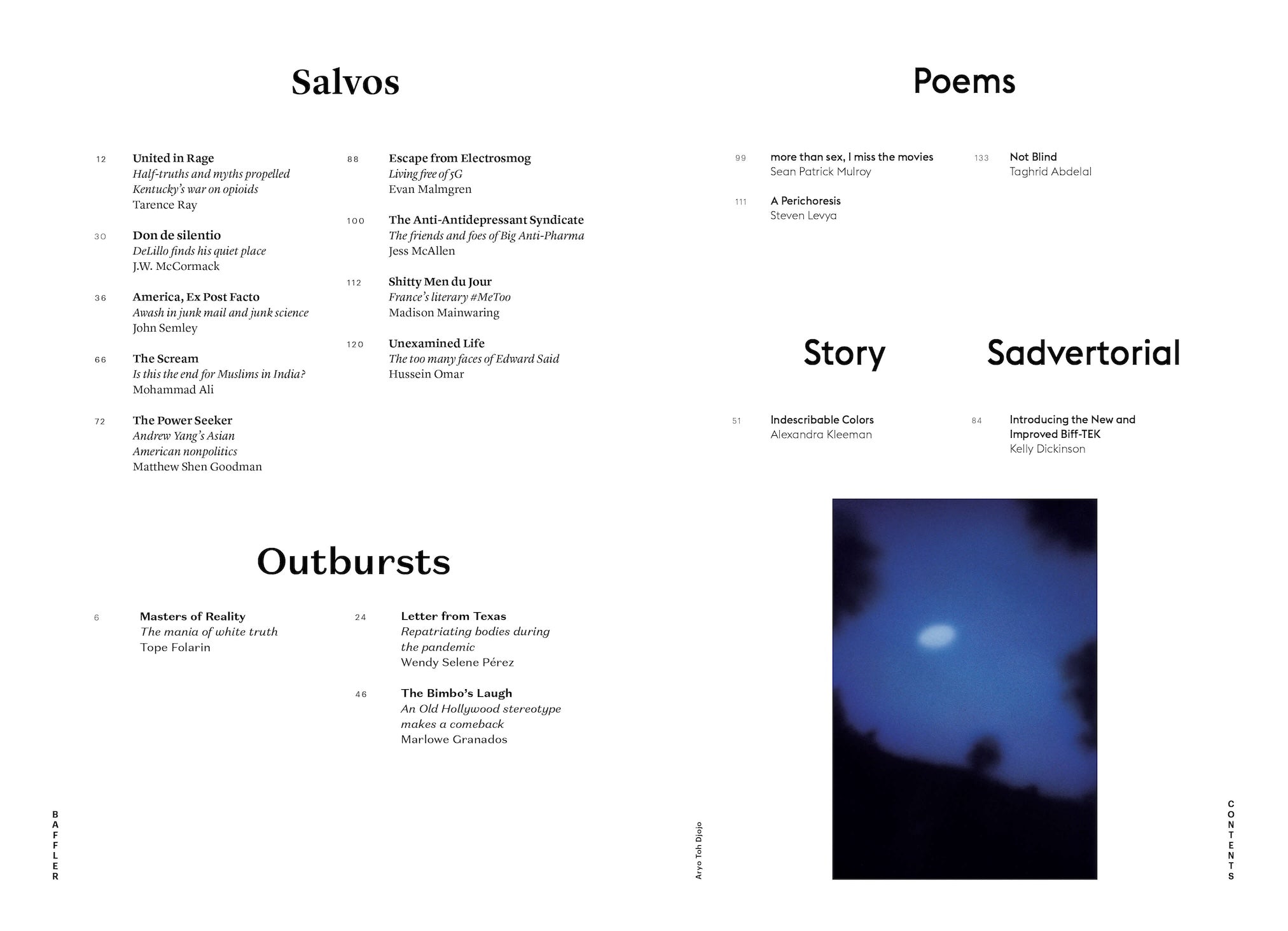 We don’t know how to cut through this electrofog—to find what David Hume called “the secret connexion” that explains why one event follows another. But we suspect whatever works will keep to the light of Jess McAllen’s “The Anti-Antidepressant Syndicate,” which uncovers Marxists and Scientologists alike in its effort to get to the bottom (or the top) of the anti-psychiatry debate. Or Evan Malmgren’s strange trip into the Quiet Zone of those living in fear of 5G. Or Marlowe Granados’s defense of the bimbo—a figure in pop culture who is always beset by nasty rumors. Or J.W. McCormack and John Semley’s inquiries into the fiction of Don DeLillo and Thomas Pynchon, respectively, or new fiction from Alexandra Kleeman—all consulted or presented here, but never made into an instrument, a smokescreen, or even a rumor.