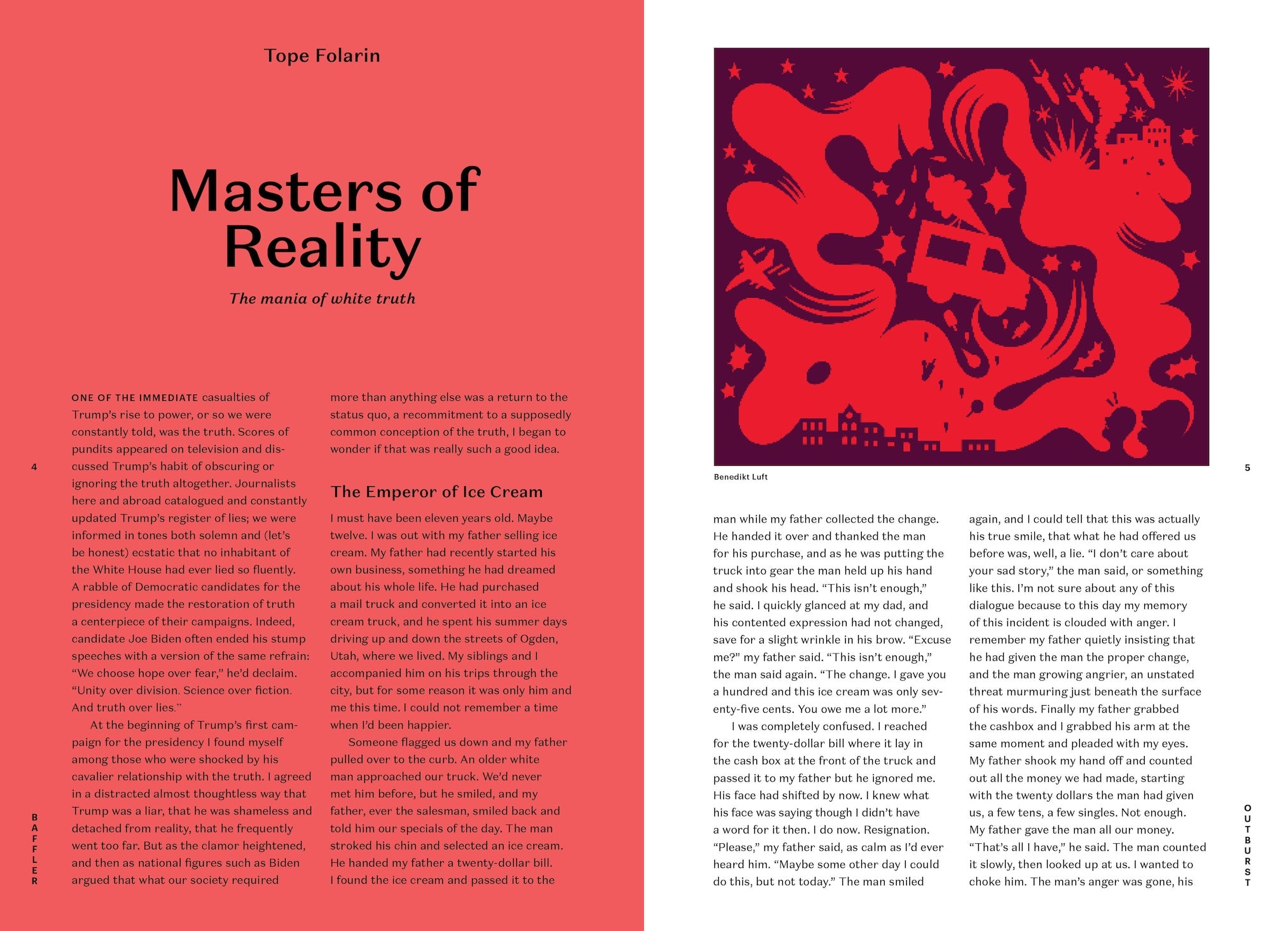 The epistemic weather is inclement. Possibly the most storm-damaged truth claim of all is the one that promises market exchange can provide a stable foundation for democratic life. It’s this dying rumor of liberalism that Tope Folarin considers in “Masters of Reality,” the opening essay of this fifty-eighth issue of the magazine, where the childhood memory of a transaction gone wrong hints at the white arrangement of truth. In very much the same spirit, Tarence Ray’s “United in Rage” has in its sights the web of myths that’s pushed the opioid crisis in eastern Kentucky, a region plagued by the kind of transactional logic that has offered the poor not the truth but rather another means to die. Their mortal remains are often subject to yet more bureaucratic dealing, as we hear in Wendy Selene Pérez’s “Letter From Texas,” a story of migration, debt, and a family’s struggle to repatriate a loved one’s ashes to Mexico at the pandemic’s height. Mohammad Ali, meanwhile, writes of his experience reporting on Hindu vigilantes in Modi’s India, where a “fringe” ideology has now become a constant threat to the country’s Muslim population and journalism’s “conventions of self-effacement and objectivity” are little match for the grief and fear endured by Muslim reporters.