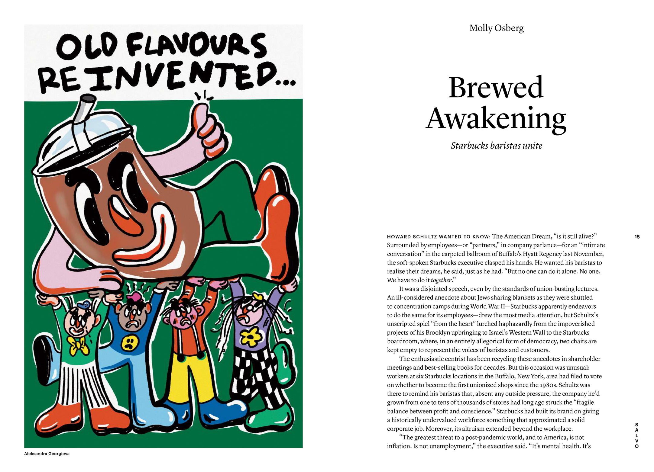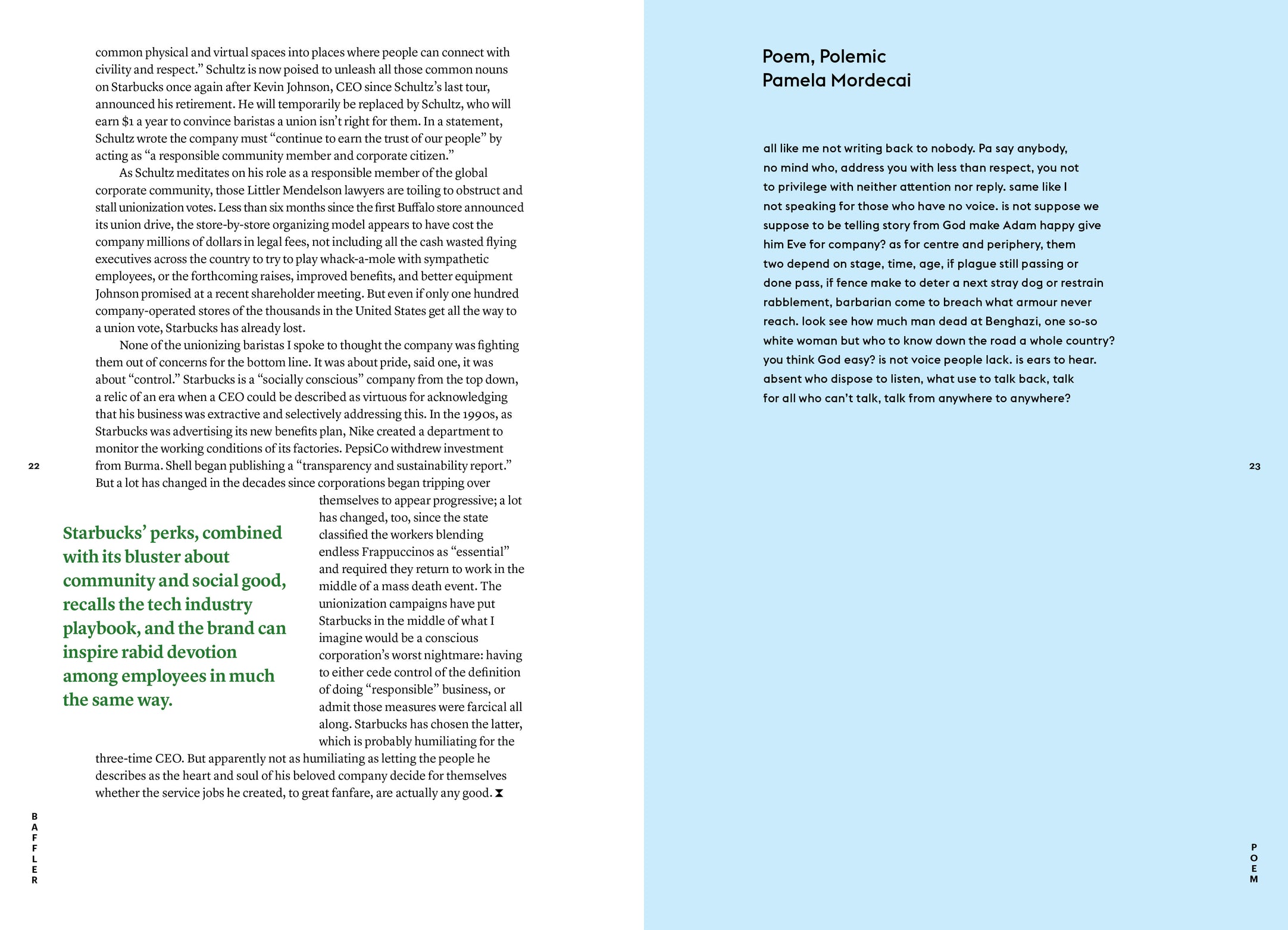 Molly Osberg zeroes in on Starbucks CEO Howard Schultz as a modern-day union buster with “a weakness for sentimental messaging,” even as the company he says is devoted to “social responsibility” retains a thirty-lawyer team at a notorious anti-union firm. As Osberg shows, the Starbucks suits are hard at work telling baristas “we’re all in this together” while using the old tricks and plenty of new ones to divide their employees. One executive warned that a unionization drive could jeopardize the free Spotify subscriptions the company offers.