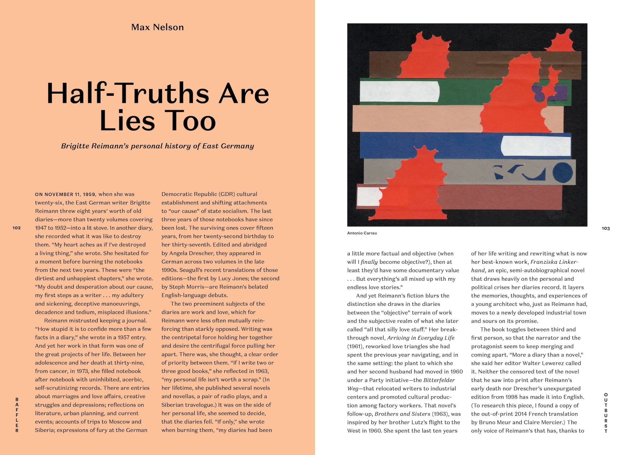Meanwhile, Dan Albert sorts through the messy politics of transit in the United States and finds that a functioning car is often a necessity for a working person. Jérôme Tubiana explains how migrants in sub-Saharan Africa make easy prey for jihadi recruiters, who prey on cash-strapped young men to wage war. And Max Nelson reads the work of Brigette Reimann, an East-German writer who, like her peers, searched for objective truth—and, in her diaries, “gives up on finding it and throws herself into the judgment of an unknowable future.”