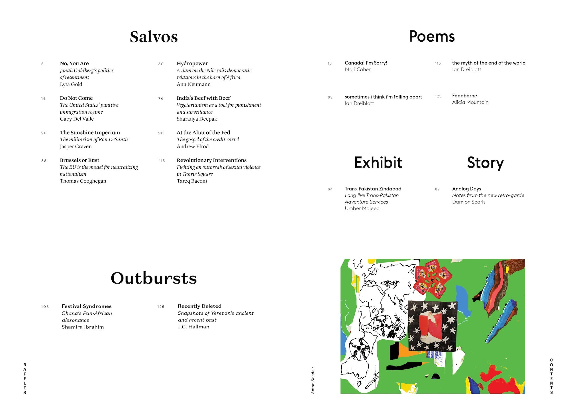 Elsewhere in the issue, our authors consider those already subsumed by these bleak homogeneities. Vegetarianism is elevated to national creed in Sharanya Deepak’s report from an India shifting rightward, where Dalits and non-Hindus find themselves harassed and beaten for the act—and sometimes the mere suspicion—of eating beef. Tareq Baconi writes of the dilemmas faced by grassroot feminist activists in Egypt caught between imperial legacies and a neopatriarchal order. Umber Majeed’s collages imagine a world where Pakistanis dispossessed by the war on terror may virtually experience the country’s twenty-first century economic revitalization. And Gaby Del Valle chronicles the labyrinthine immigration bureaucracy that confronts migrants to the United States, where this country’s political parties are unanimous in telling them, to quote Kamala Harris in Guatemala nearly two years ago, “Do not come.”