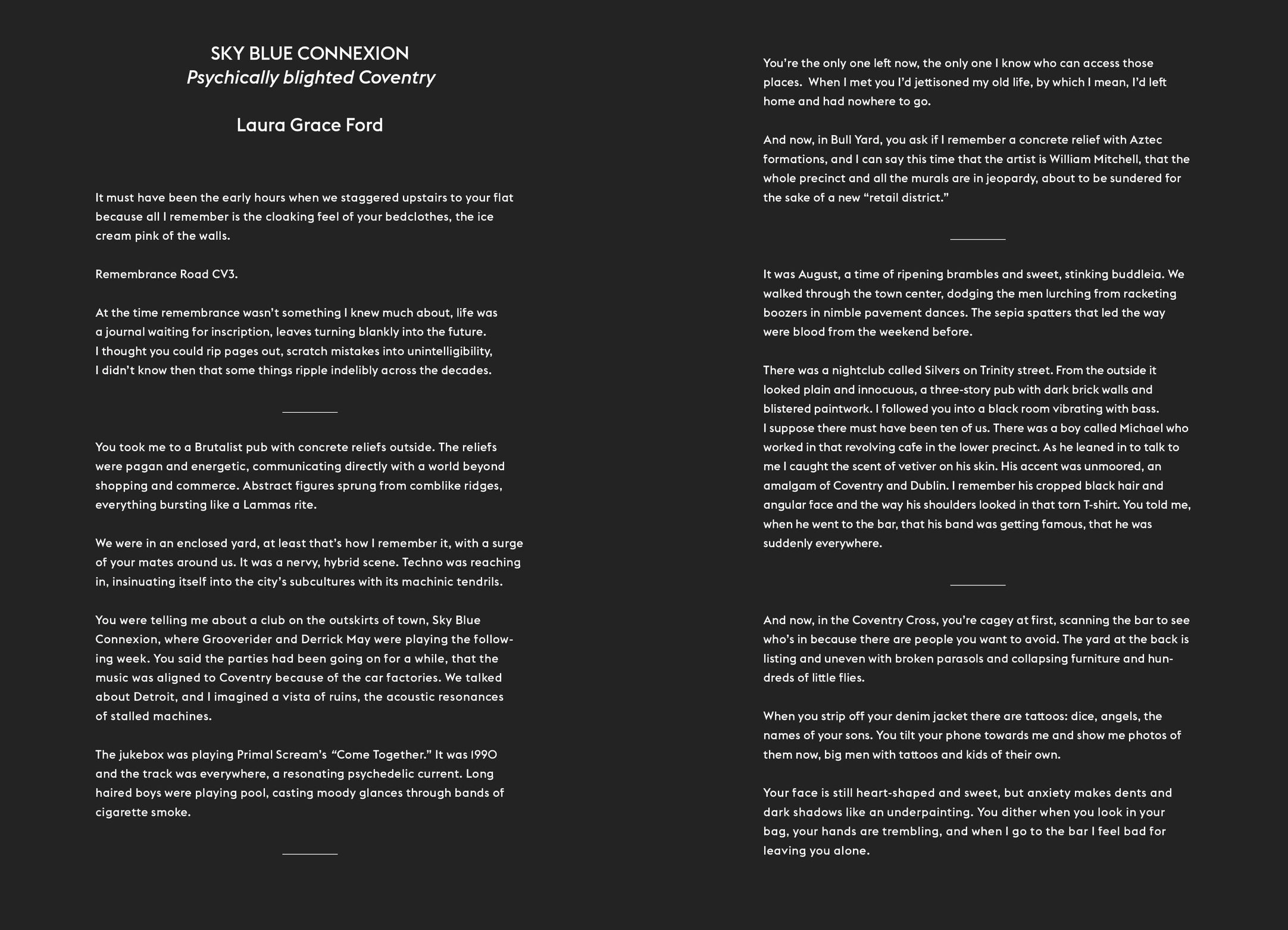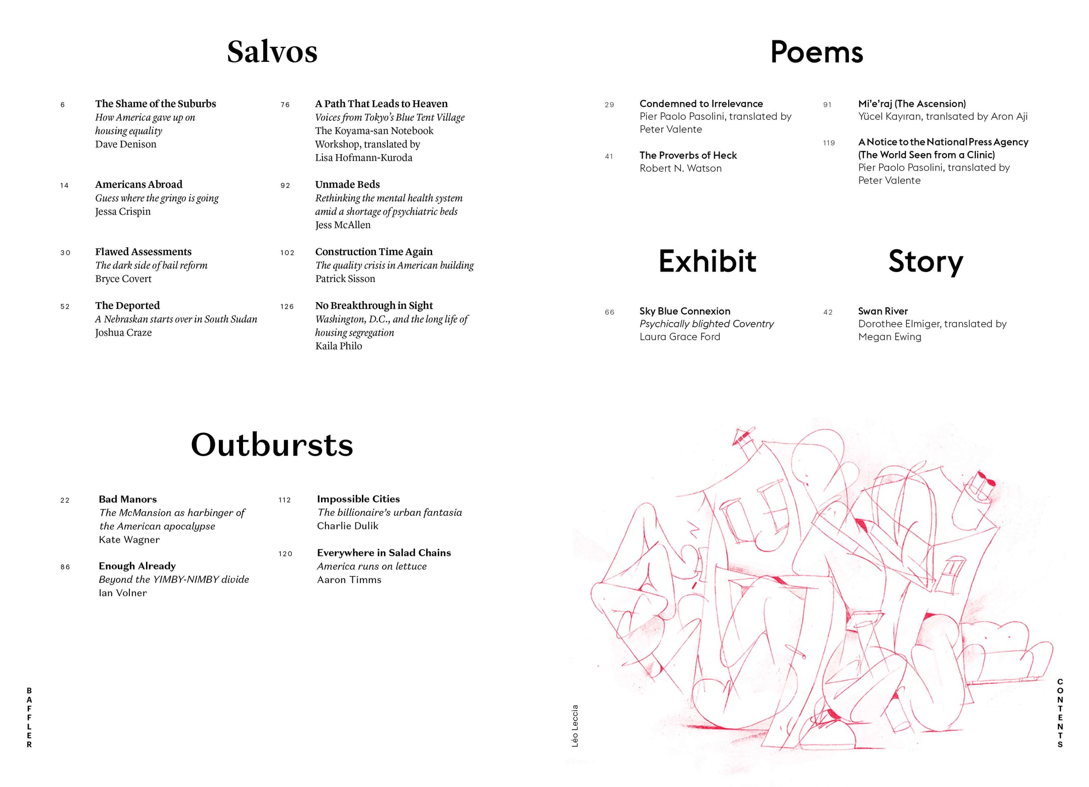 Not that the suburbs weren’t already memorials to housing failures, as Dave Denison argues while revisiting the 1985 classic Crabgrass Frontier, which chronicles the federal government’s mid-century role in keeping the suburbs lily-white. Focusing on the country’s capital, Kaila Philo traces the persistence of racial disparities in housing some fifty-five years after the Fair Housing Act, despite its intent to help realize a multiracial democracy in this country. Sadly, the most ambitious visions for housing now seem to come from tech billionaires dabbling in utopic urban planning, but as Charlie Dulik writes, these crypto-cities say more about their would-be founders’ fears and dreams than how we might actually accommodate anyone. These supposed marvels of technological splendor will likely run on salad, as do knowledge workers today, according to Aaron Timms—at least those not eating pastéis de nata in Lisbon and bandeja paisa in Bogotá while typing away in their Airbnbs, as Jessa Crispin describes in her reflections on the American cosmopolitan. Laura Grace Ford wanders through the blighted landscape of Coventry, where life crawls along through the ruins of industrial collapse.