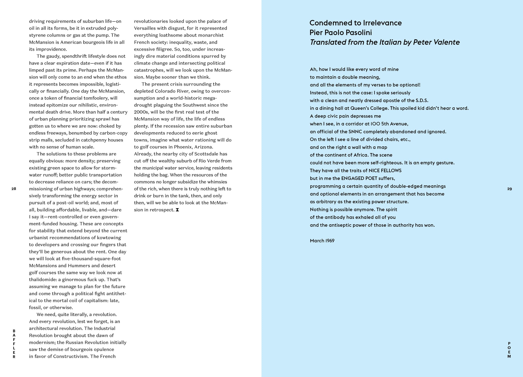 How do we put more people in homes, and how do we make sure they’re able to stay there? The interminable debate has seen YIMBYs and NIMBYs become the Hatfields and McCoys of housing; Ian Volner braves the yay-nay vitriol to ask whether the whether is the problem, when there’s so much to be pondered with regards to the what—as in what exactly are we building in our backyards, and have built already? Poorly insulated buildings that are hazardous to our health, Patrick Sisson answers, in his survey of American construction. Nothing exemplifies this more than the country’s undying preoccupation with the McMansion, as Kate Wagner points out, which has survived financial crises and ecological catastrophes to become a suburbanite monument to this country’s will to self-annihilation.