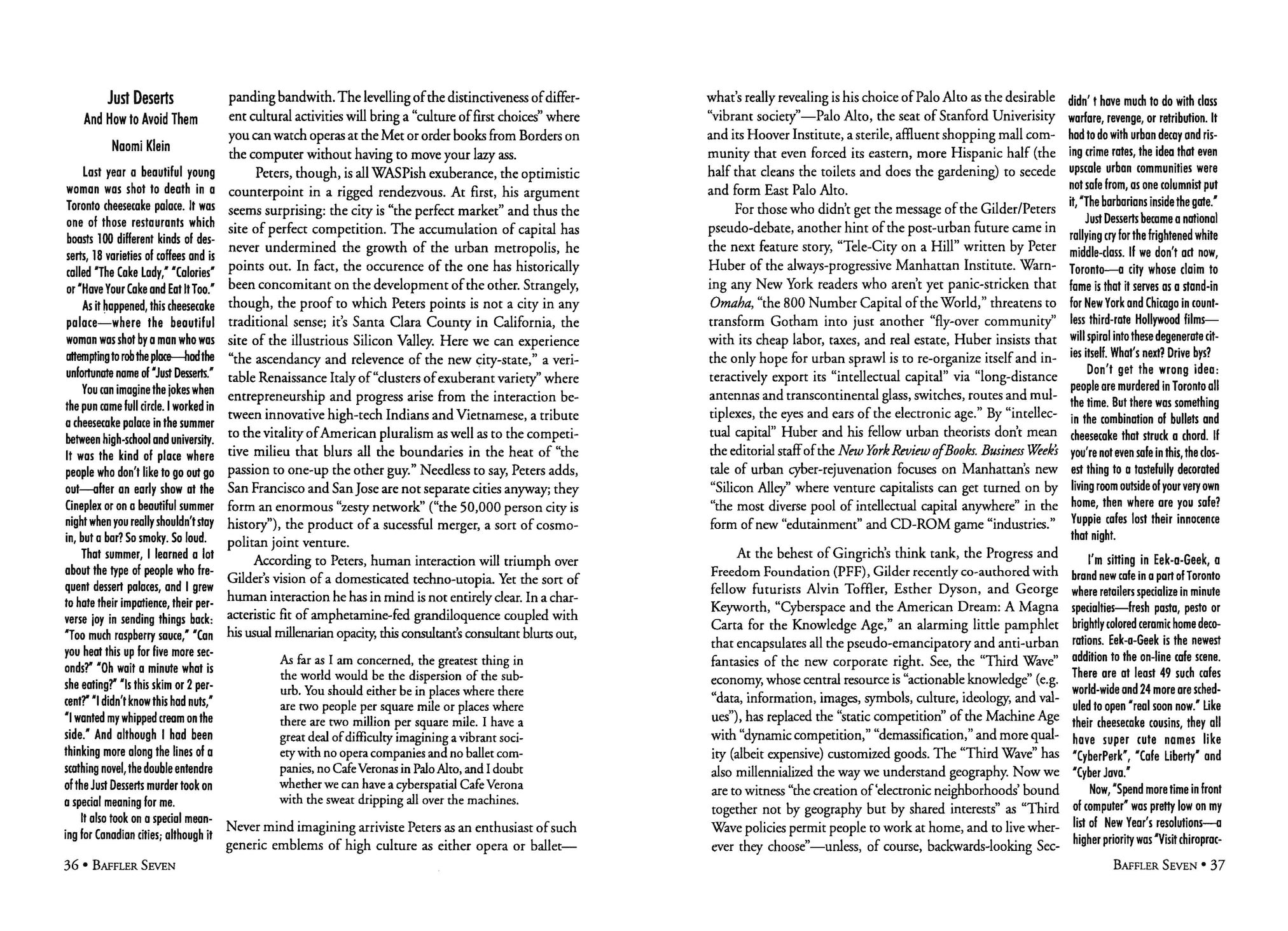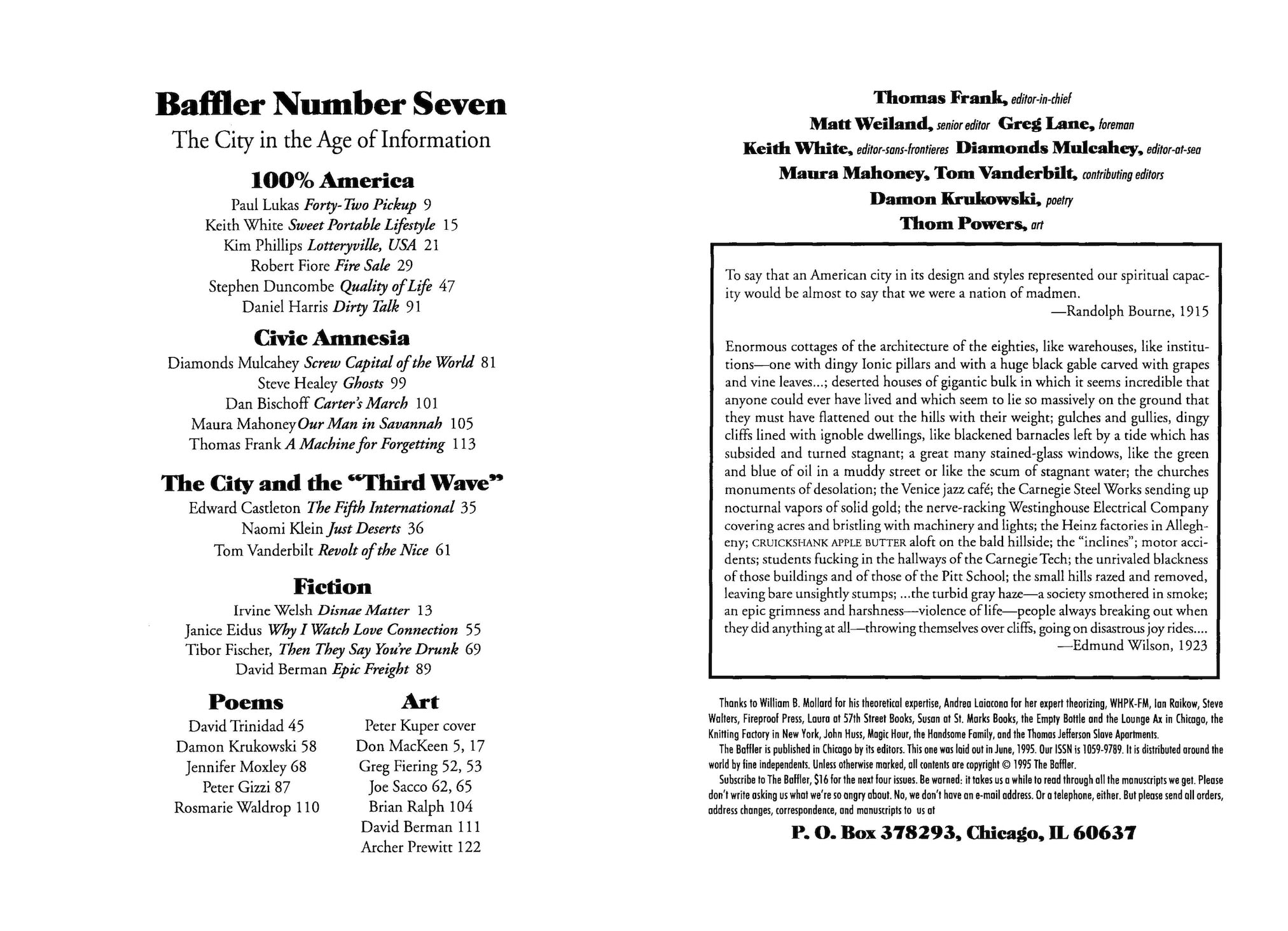 A gimlet stare at what twentieth-century capitalism has done for the American metropolis. Keith White reads city lifestyle magazines. Paul Lukas pays a visit to Times Square, then a retail wasteland. Naomi Klein hangs out at an online café. Maura Mahoney reads Midnight in the Garden of Good and Evil and finds it depicts Savannah, Georgia, as a Southern Gothic theme park. Dave Mulcahey reflects on the “Screw Capital of the World”: Rockford, Illinois. Kim Phillips-Fein regrets how lotteries bilk the poor, and Stephen Duncombe rankles at the way cities police them. Plus: dialect fiction by Irvine Welsh.