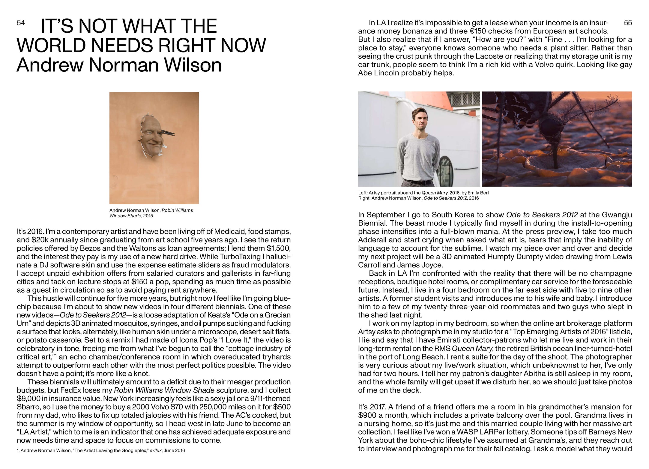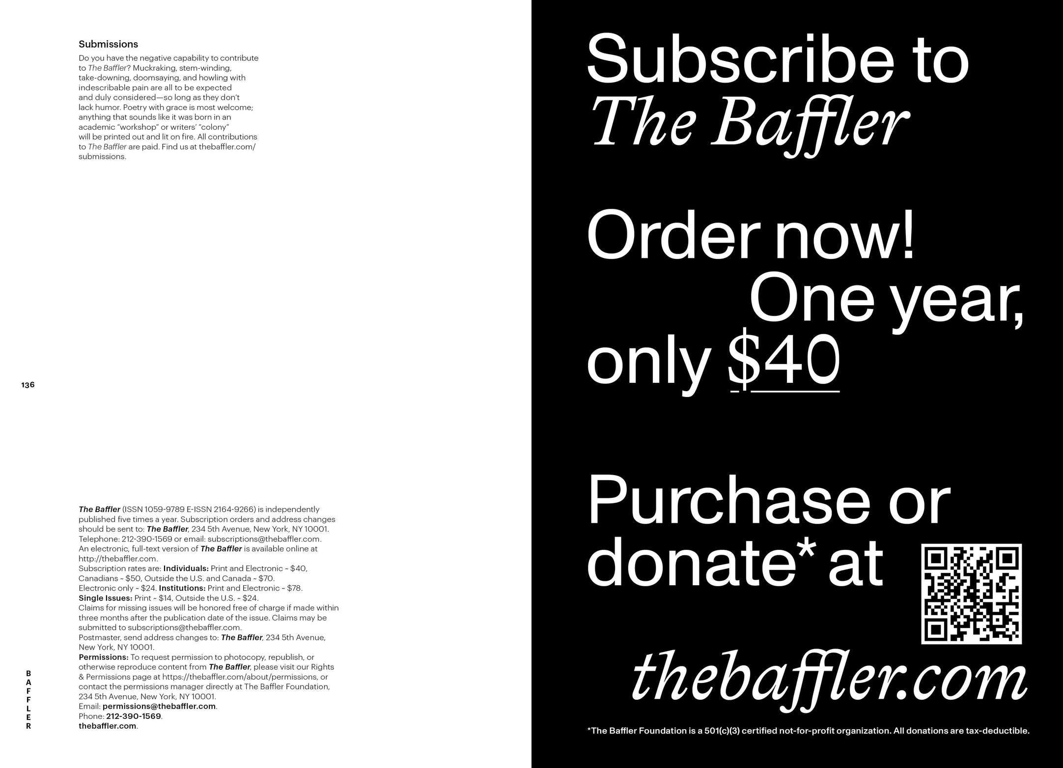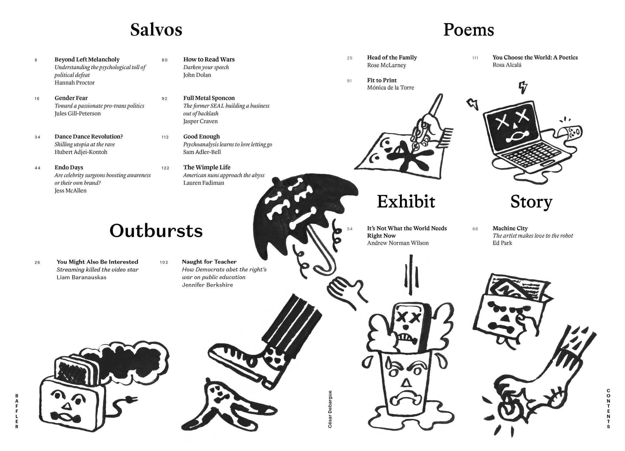 When reengaging, best to avoid easy absolution and fictitious succor. This is often easier said than done, as Jess McAllen demonstrates in her study of celebrity endometriosis surgeons, who have flourished by offering supposed cures in an environment of misinformation and false promises. Hubert Adjei-Kontoh lambasts the too-easy conflation of dance music’s emergence from the marginalized with its supposed ability to bring about utopia, while Liam Baranauskas makes a plea to free ourselves from the isolating tyranny of the Netflix algorithm in favor of seeking ourselves in others, that “most affecting and holy of reactions to art.” He finds common cause then with Andrew Norman Wilson, who narrates his departure, replete with a rib removal and an episode of penguin-induced dissociation, from a contemporary art world whose works serve no one but yacht owners and curatorial bureaucrats with terminal degrees.