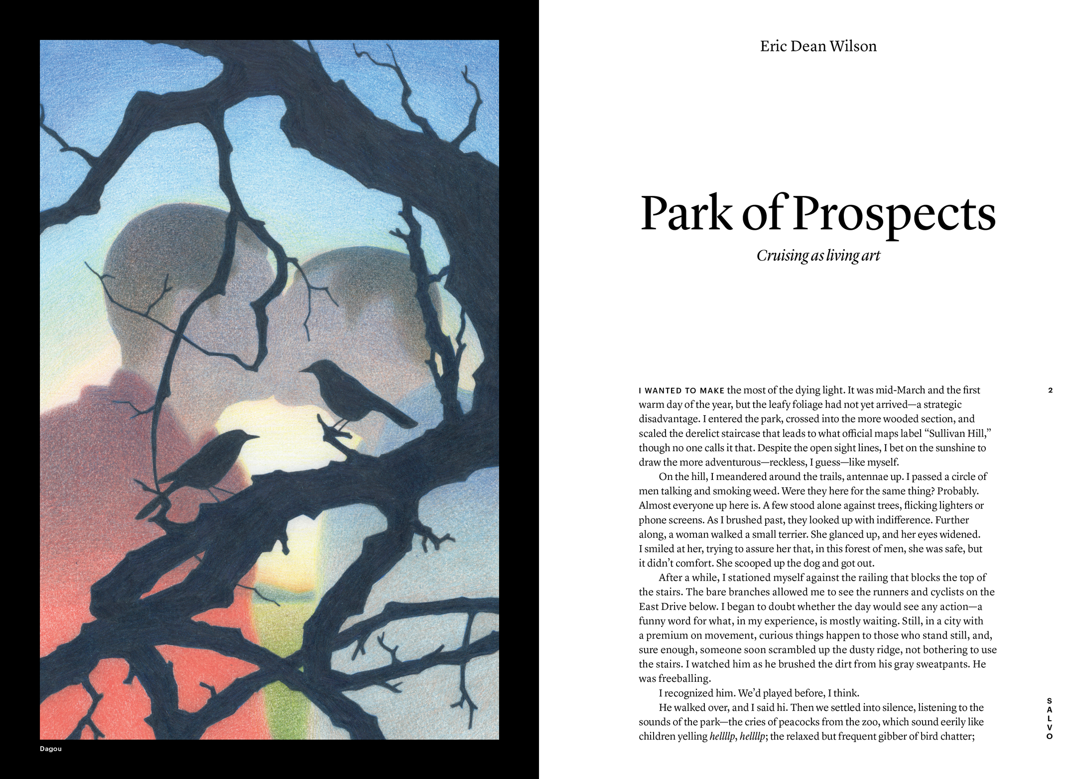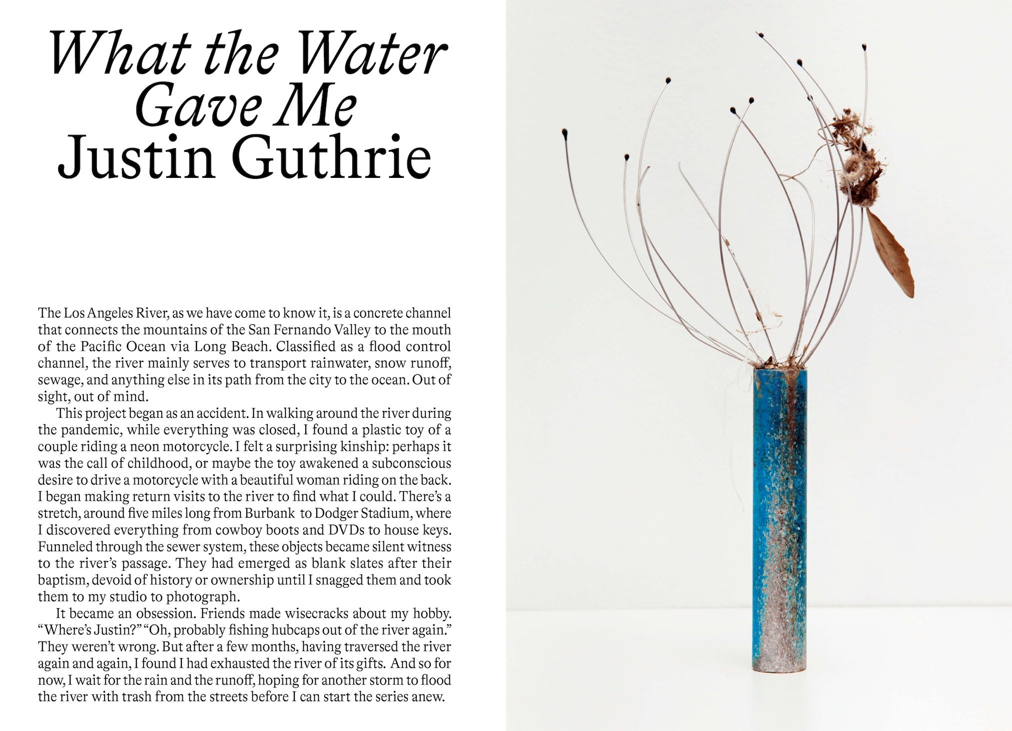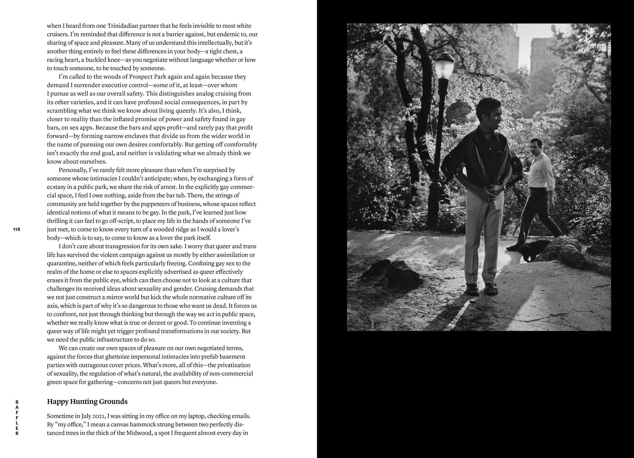 There can be promise in waiting, however: Jack Sheehan considers what a finally united Ireland might look like, even as a shifting party landscape and the political rise of an Irish far right complicate the picture. Eric Dean Wilson writes on more than a decade of cruising and whether the analog experience of patiently seeing who’s around might combat sex’s domination by the apps and the gentrification of queer life. His essay is accompanied by photographs from the late 1960s by Arthur Tress depicting cruising in New York’s Central Park, a series Tress has only recently begun to show publicly. Fret as we might over life’s various ticking clocks, art rewards such forbearance (though a race can be inspiringly bizarre, per the issue’s short story by Manuela Draeger, translated from the French by Brian Evenson). Ed Park describes his rediscovery of an unpublished 1998 manuscript during the pandemic, finding a “document of sustained artistic bliss” he had yet to experience again. And Justin Guthrie contributes a series of portraits of discarded objects picked out from an obsessive period of trawling the Los Angeles River, the photographer now waiting for the waters to deposit another haul of trash he can make his own.