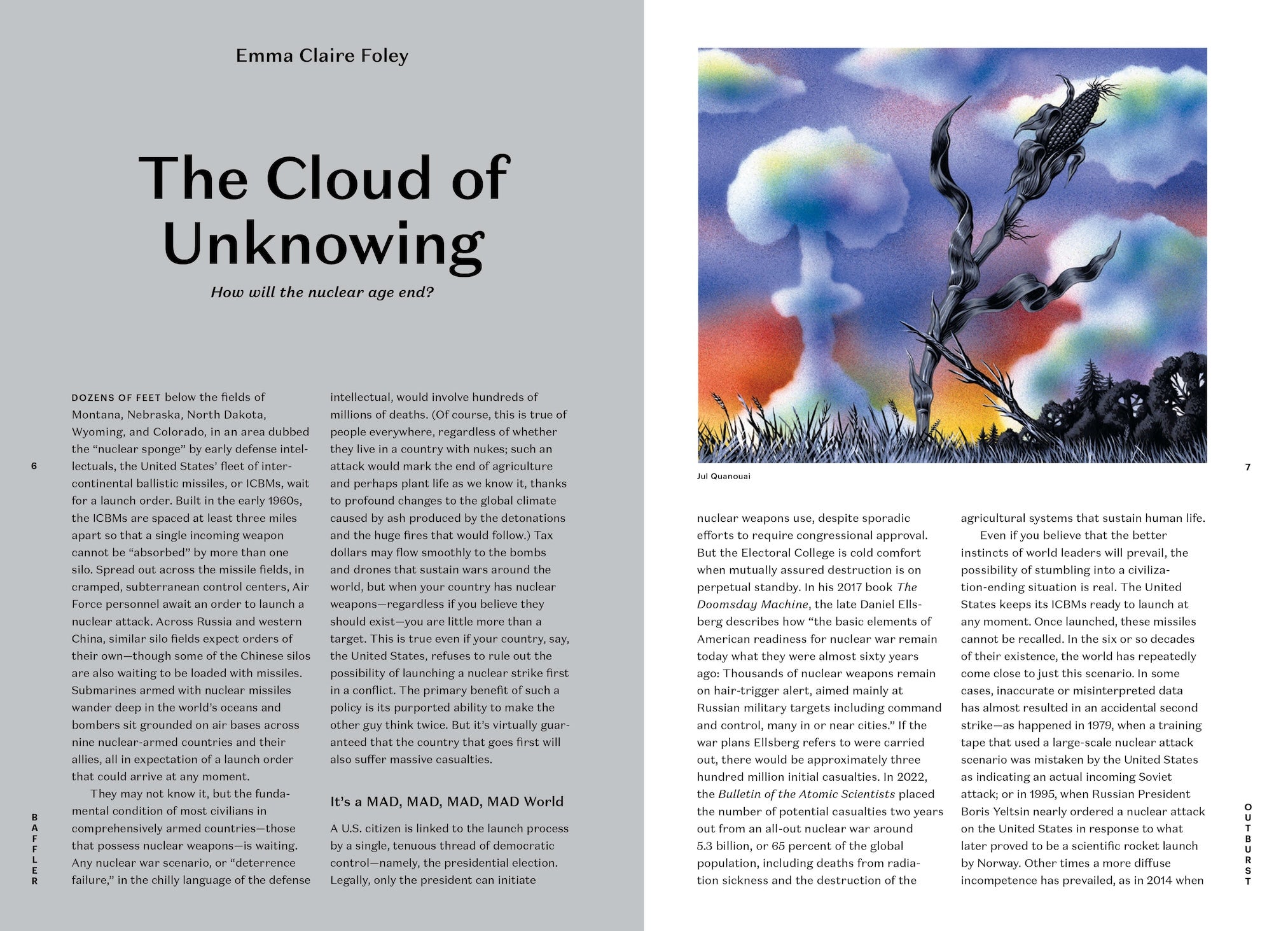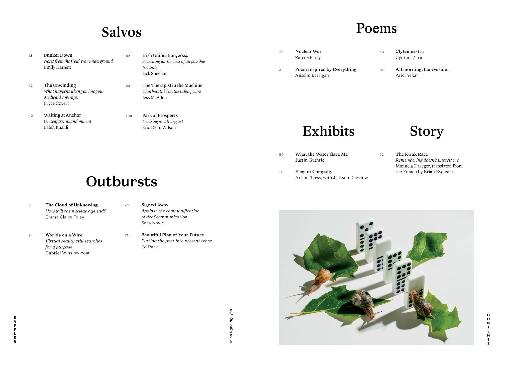 We have already endured years of near-misses by nuclear-weapons states—solar flares and training exercises mistaken for imminent attacks to be responded to with the most lethal capacity—as Emma Claire Foley points out in her essay for “Get in Line,” which considers the ways in which we wait today and for what exactly. Elsewhere on the nuclear question, Emily Harnett takes the reader on a tour of decommissioned missile silos in America’s heartland, Cold War weapons infrastructure now rented out on Airbnb or memorialized as patriotic kitsch. On the subject of cheap spectacle, Gabriel Winslow-Yost considers the promise of virtual reality, which seems to only improve in proportion to the real world’s degradation. Jess McAllen surveys the landscape of AI therapy bots: ill-equipped to deal with the complexities of mental health, they are yet another impoverishment of our health care experience. Few understand this more acutely than the poor, as Bryce Covert writes, pushed off of Medicaid across the country by the millions. Waiting on the powerful’s whims, too, are seafarers, who, as Laleh Khalili argues, have little redress against shipowners who fly flags of convenience and leave crews in limbo at sea.
