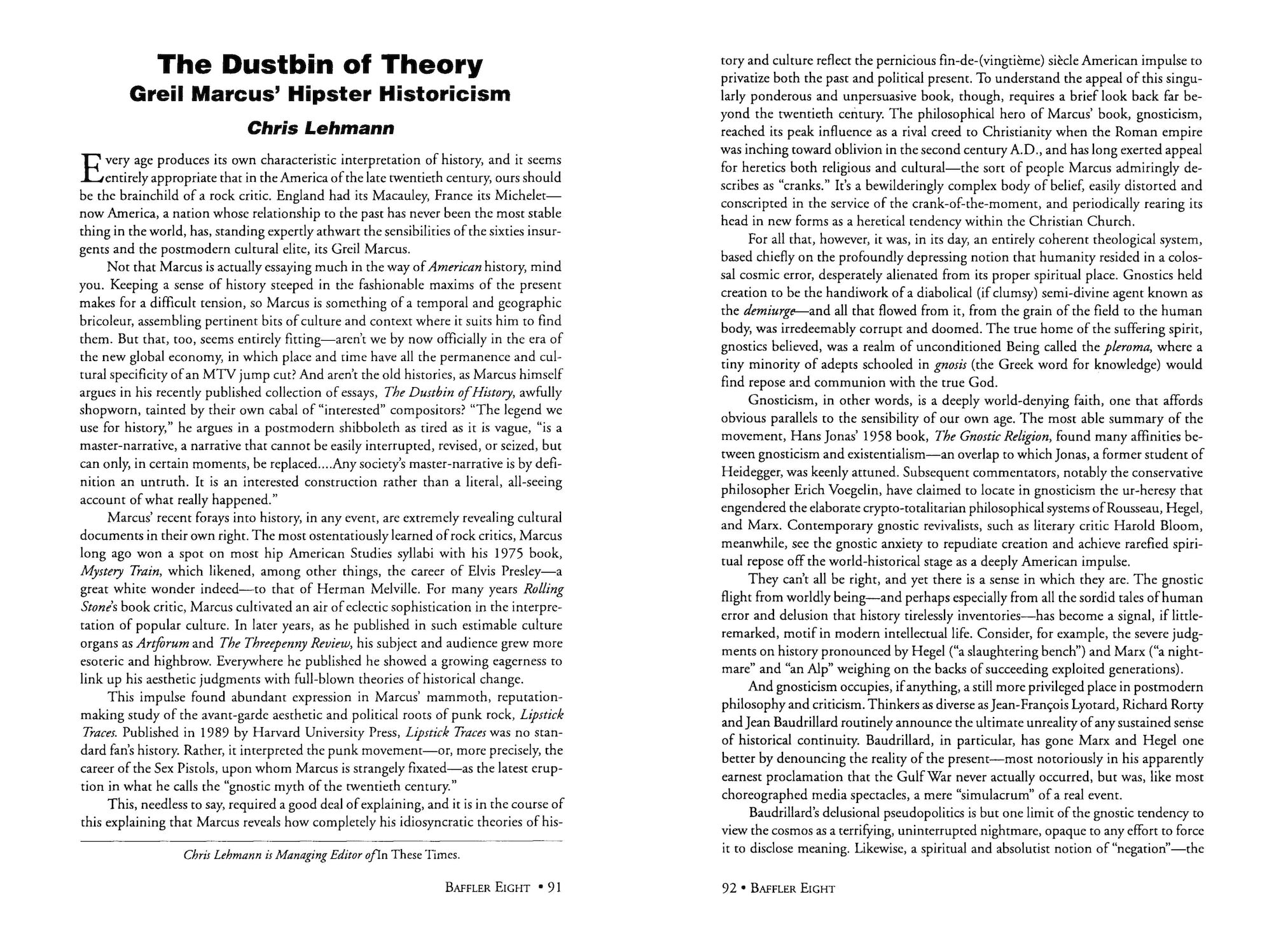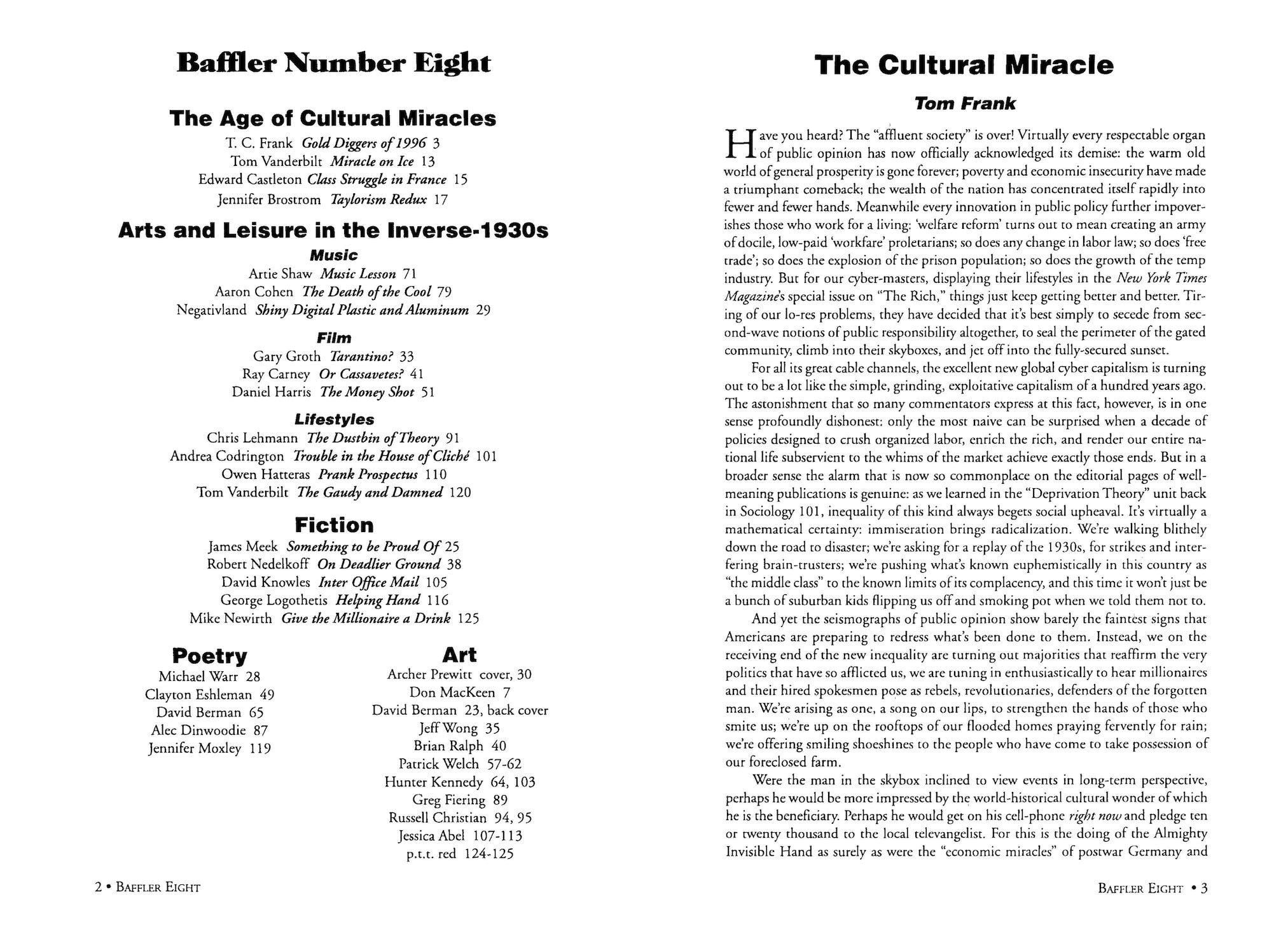 “For all its great cable channels, the excellent new global cyber capitalism is turning out to be a lot like the simple, grinding, exploitative capitalism of a hundred years ago,” writes Thomas Frank in the lead essay, in which he begins to explore the ways we deceive ourselves about our basic economic interests. Mike Newirth pours a nice frosty cosmo for the 1 percent, while Tom Vanderbilt calls Skyy vodka’s marketing efforts “a Reaganite shibboleth charted in the barroom.” Aaron Cohen praises thirties band-leader Artie Shaw; Artie Shaw remembers dealing with the music industry in the thirties. Gary Groth reads Quentin Tarantino. Daniel Harris writes about gay porn in the age of AIDS.