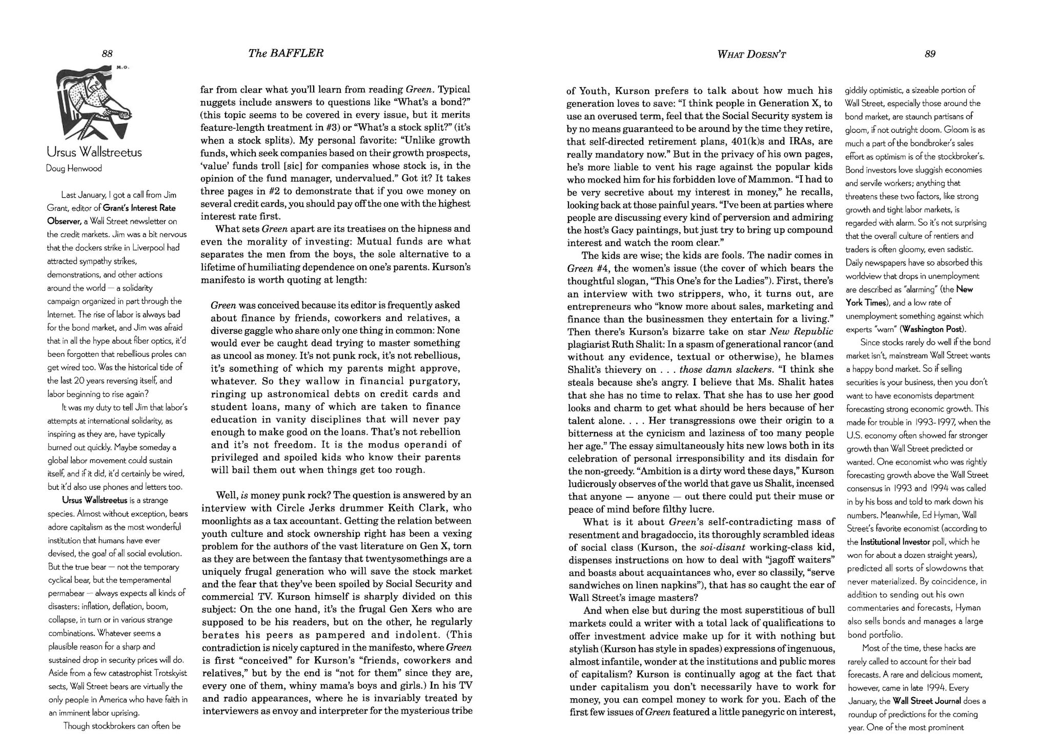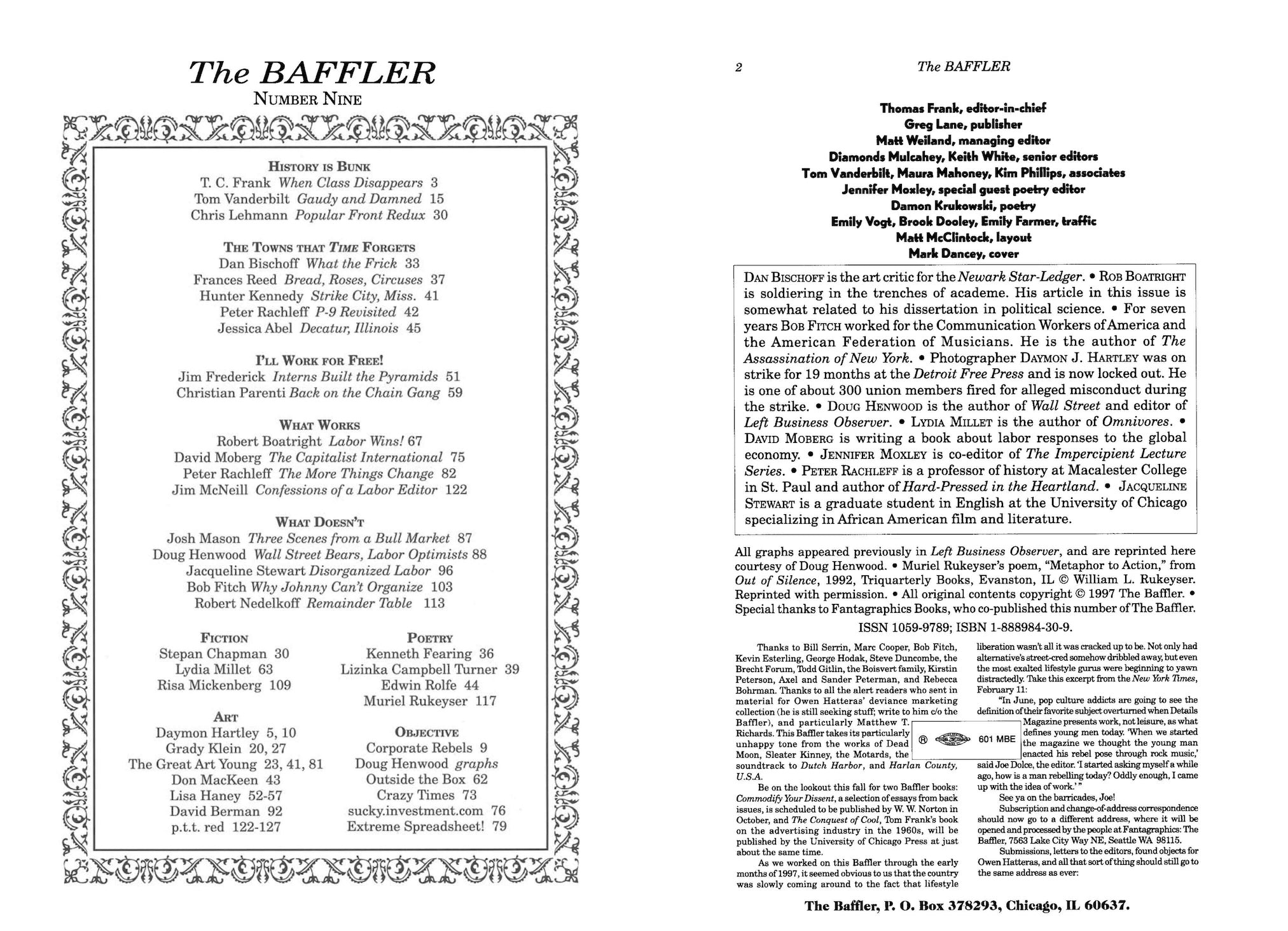 The New Economy is in full swing, and we decided to do an issue on labor. It features Jim Frederick’s classic essay on the intern economy (the spine of the issue bore the slogan “Interns Built the Pyramids”). Thomas Frank tells us how class was disappearing. Josh Mason examines the ephemera of bull-market culture, including a punk-rock investment magazine. Tom Vanderbilt rips into office culture, from Dilbert to Successories. Chris Lehmann writes on the intersection of class and labor in the American university. Dan Bischoff recalls the story of union-buster Henry Clay Frick; Frances Reed remembers the Lawrence, Massachusetts textile strike of 1912; Christian Parenti remembers prison labor and tells why it’s coming back. With fiction from Lydia Millet, a nod to authors-in-hiding by Robert Nedelkoff, and a cover by Mark Dancey.